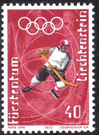 Diese Marke aus Liechtenstein (MiNr 552) zu den Winterspielen 1972 zeigt einen Eishockeyspieler.