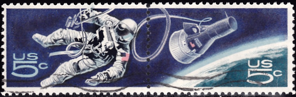 In den USA ist zum Thema "9 Jahre US-Behörde für Raumfahrt (NASA)" einn Zusammendruck von zwei Marken (MiNr 930/931) erschienen. Auf der ersten Marken wird der Astronaut Edward White frei im Weltraum schwebend gezeigt uind auf der zweiten die Gemini-4 Kapsel und die Erdkalotte.