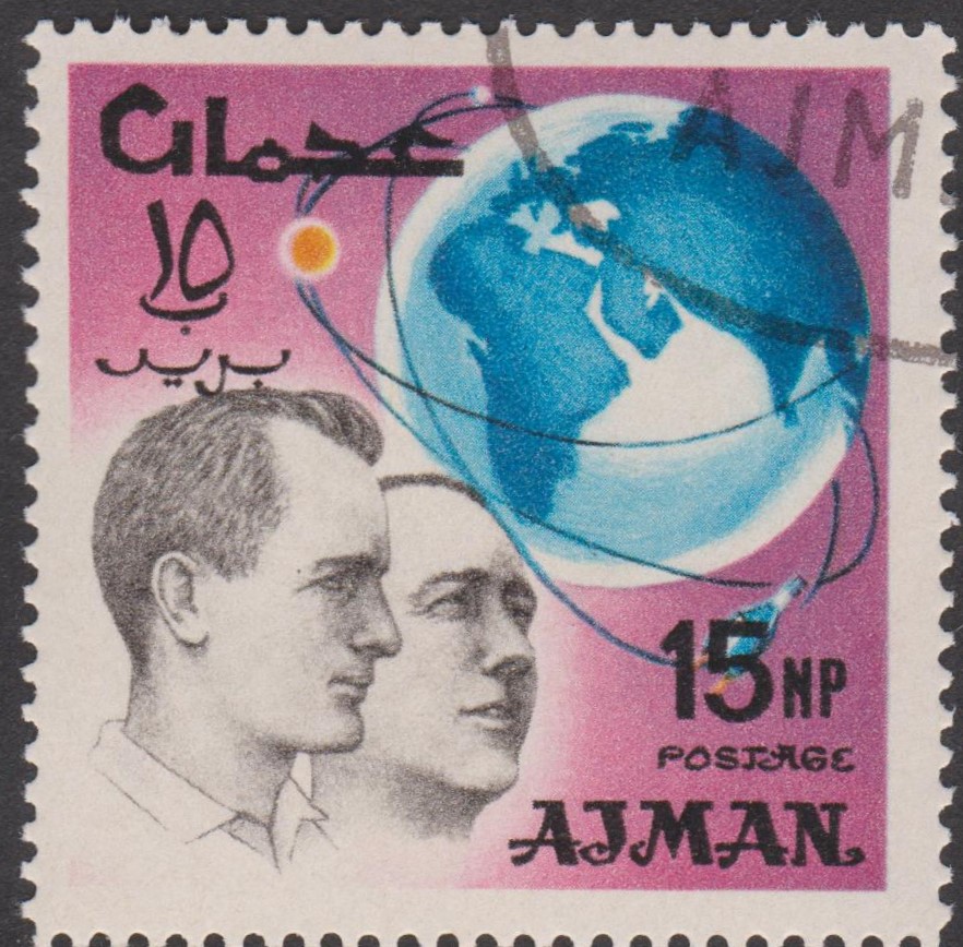 Ajman MiNr. 97 zeigt die beiden Astronauten von Gemini 4, Edward White und James McDivitt sowie die Erdkugel mit Umlaufbahnen: