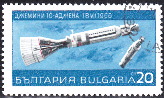 Auf dieser Marke aus Bulgarien (MiNr 1763) wird Gemini 10 beim Andocken mit dem Agena-Zielsatelliten gezeigt.