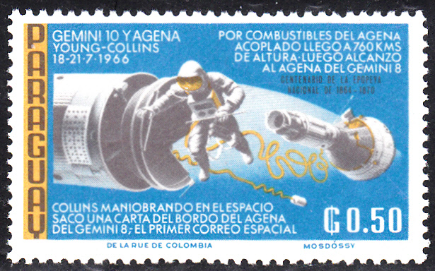 In einer Serie "Erforschung des Mondes" ist in Paraguay diese Marke (MiNr 1621) mit einer Abbildung von Gemini 10 erschienen. Die Marke zeigt den Astronauten Collins bei seinem "Ausflug" zur Agena aus der Mission von Gemini 8, um von dort eine Platte zur Bestimmung der Mikrometeoriten-Tätigkeit zu holen.