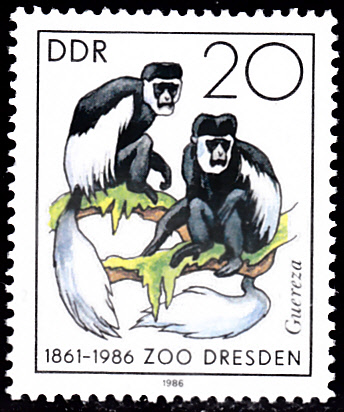 Auf der Marke zu 20Pf (MiNr 3020) sind zwei Mantelaffen oder Guereza (Colobus guereza) zu sehen. Michel beschreibt ihn als Kilimandscharoguereza (Colobus abyssinicus caudatus).