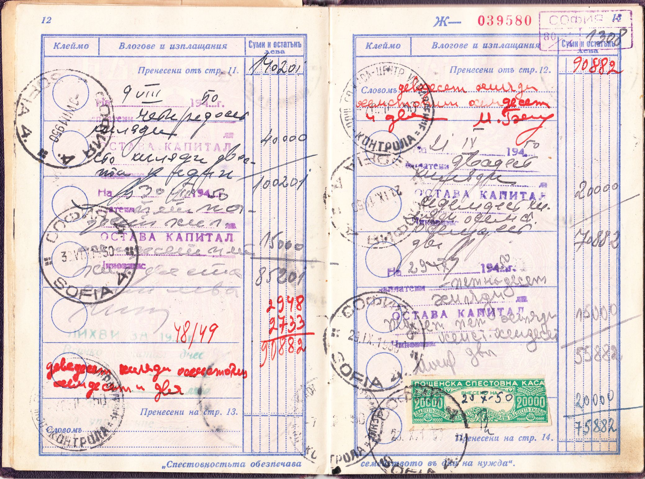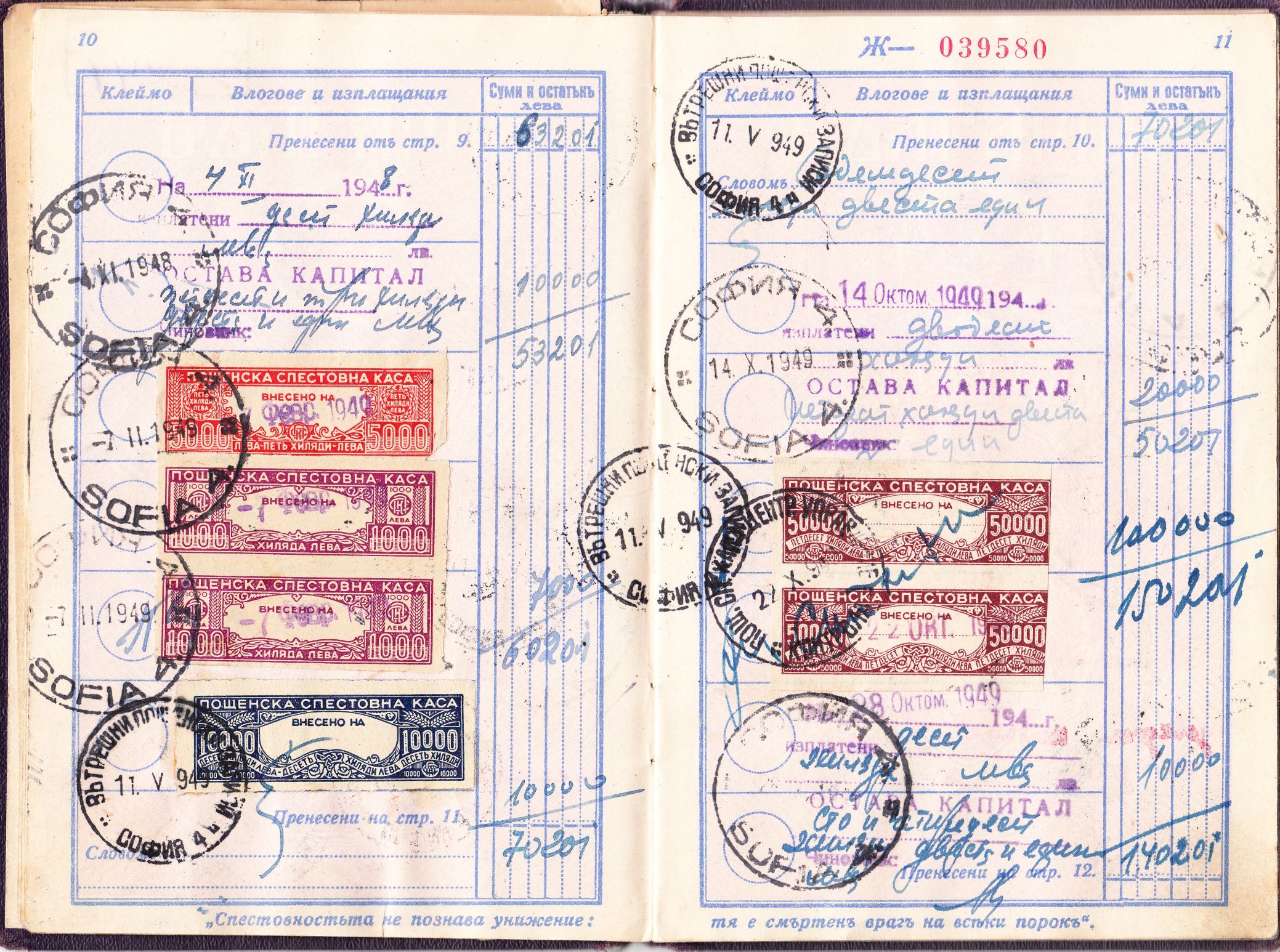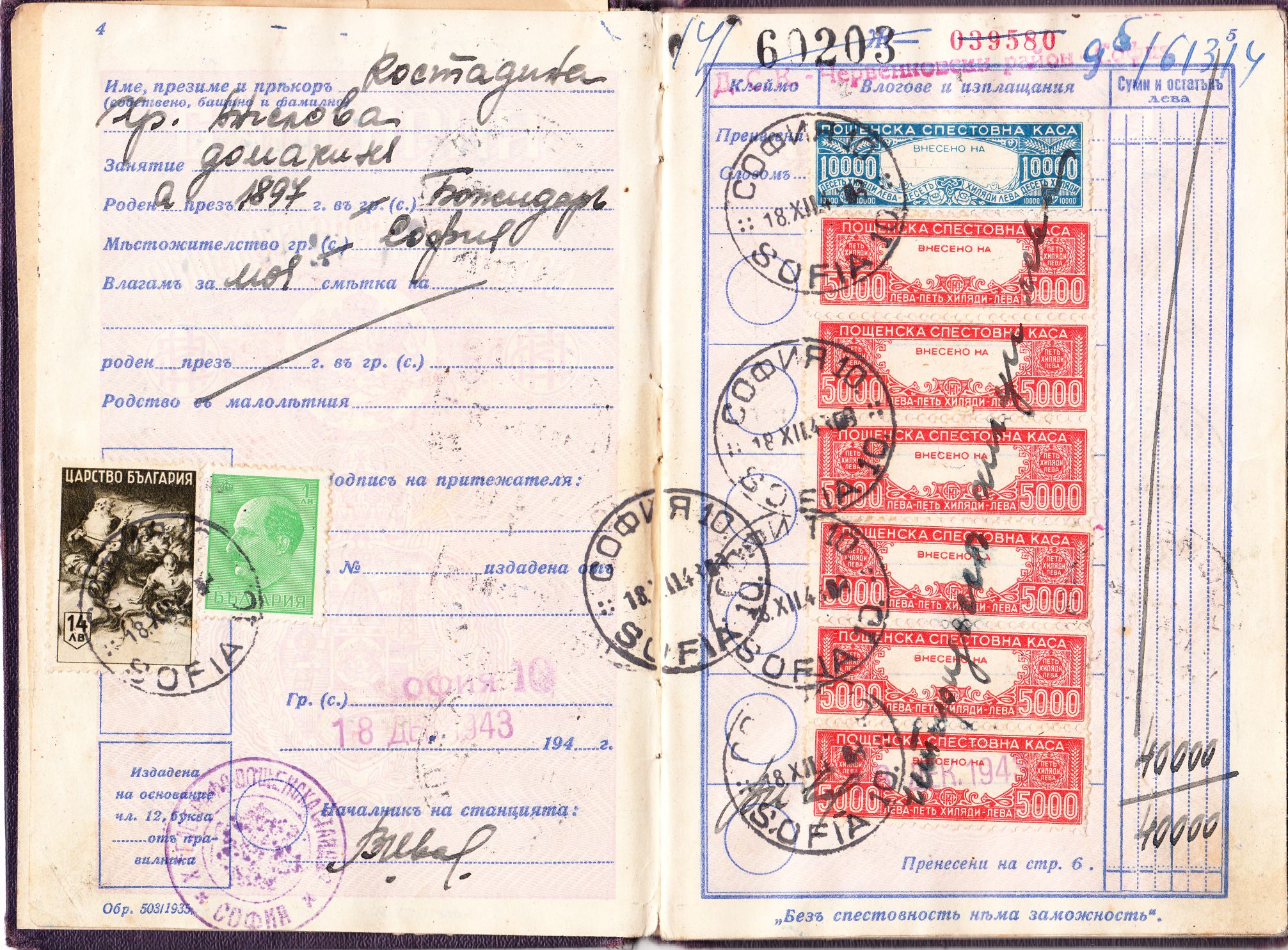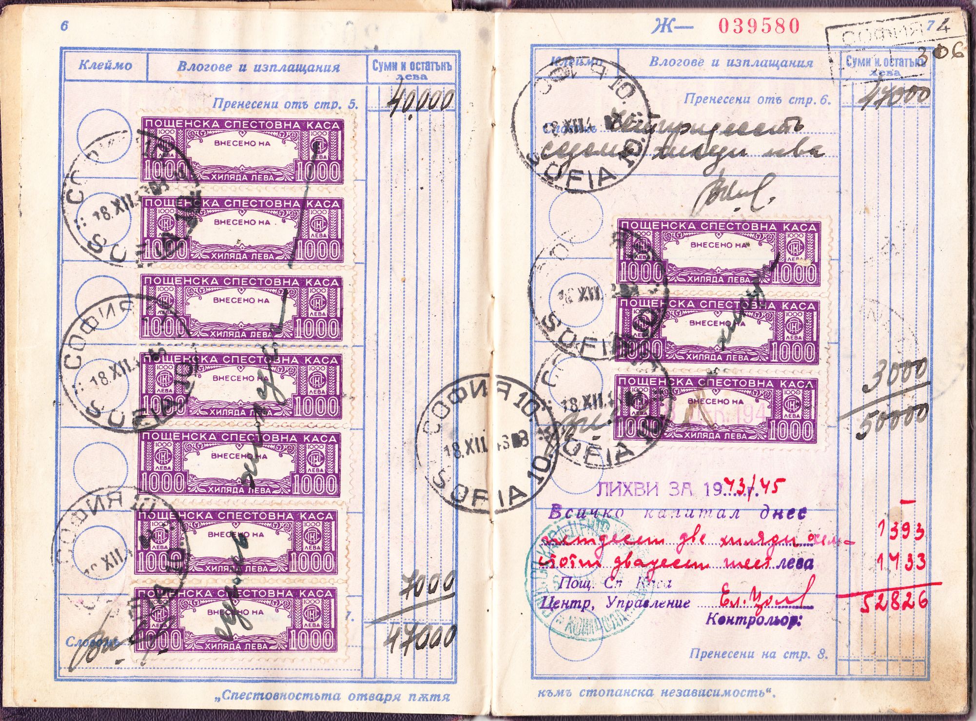 Am selben Tag wurden 40.000 Leva eingezahlt. Interessant ist, dass die Einzahlung auf der Seite 5 durch entsprechende Marken der Postsparkasse mit Inschrift "Пощенска спестовна каса" dokumentiert wurde, wobei eine Marke der Wertstufe zu 10.000 Leva sowie 6 Marken der Wertstufe zu 5.000 Leva verwendet wurden.