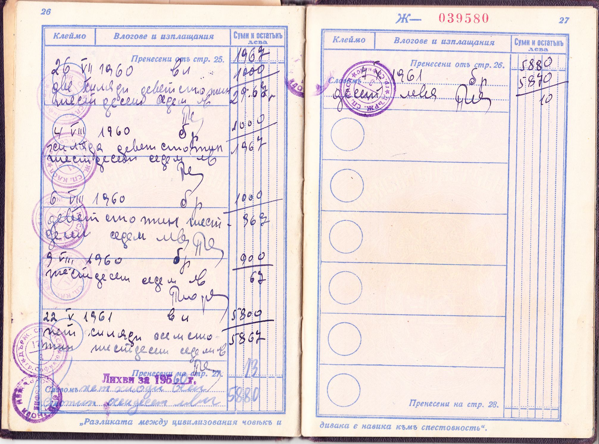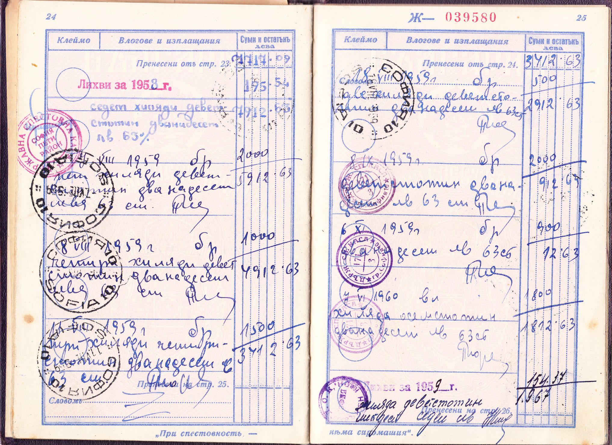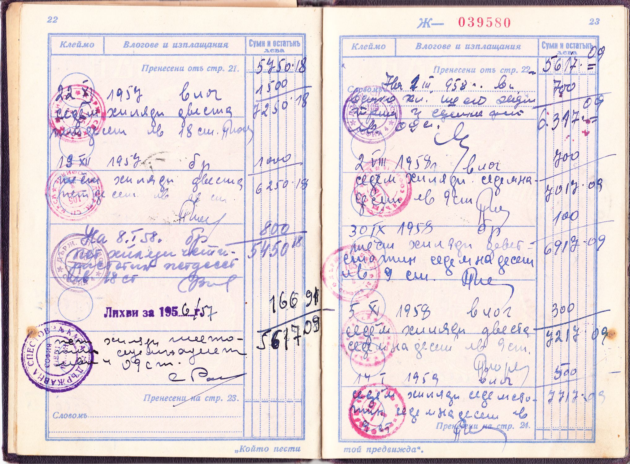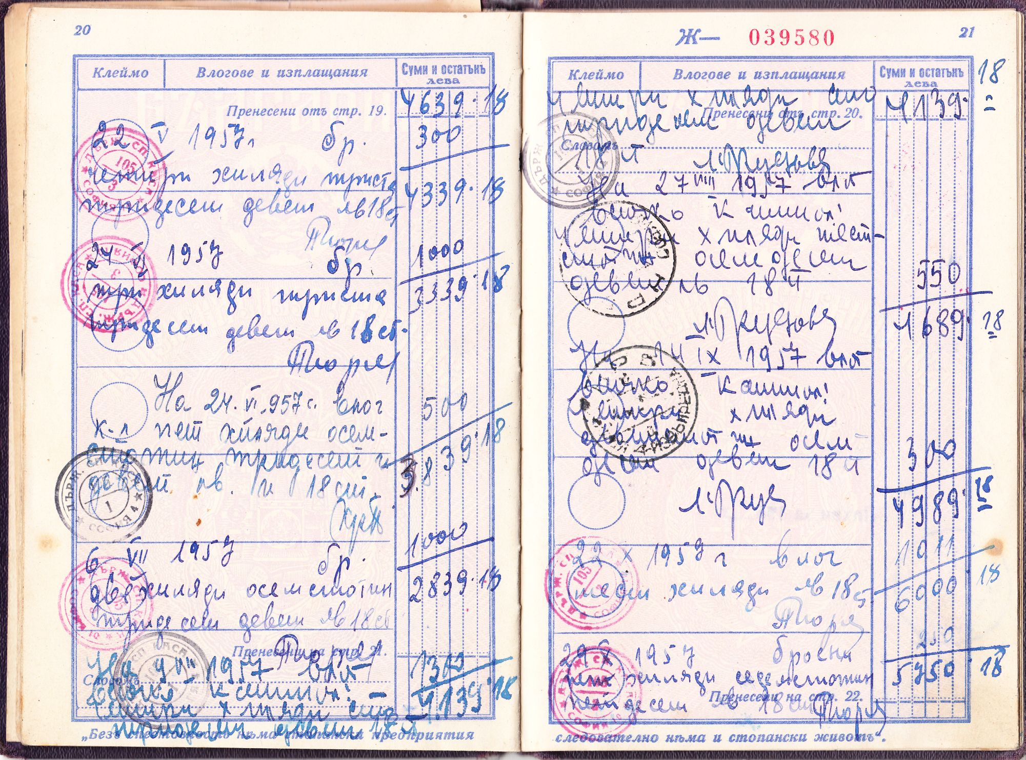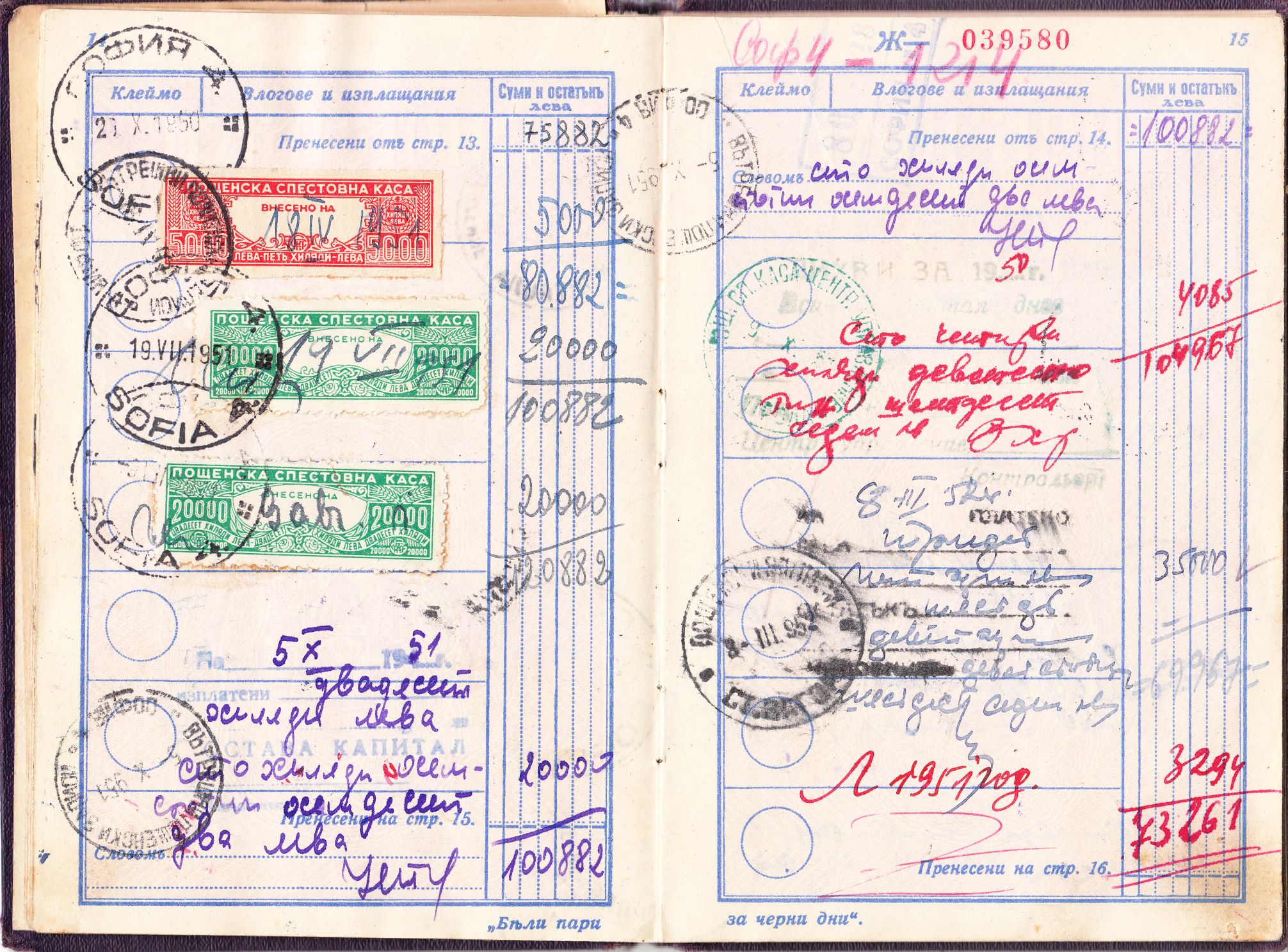 Am selben Tag wurden 40.000 Leva eingezahlt. Interessant ist, dass die Einzahlung auf der Seite 5 durch entsprechende Marken der Postsparkasse mit Inschrift "Пощенска спестовна каса" dokumentiert wurde, wobei eine Marke der Wertstufe zu 10.000 Leva sowie 6 Marken der Wertstufe zu 5.000 Leva verwendet wurden.