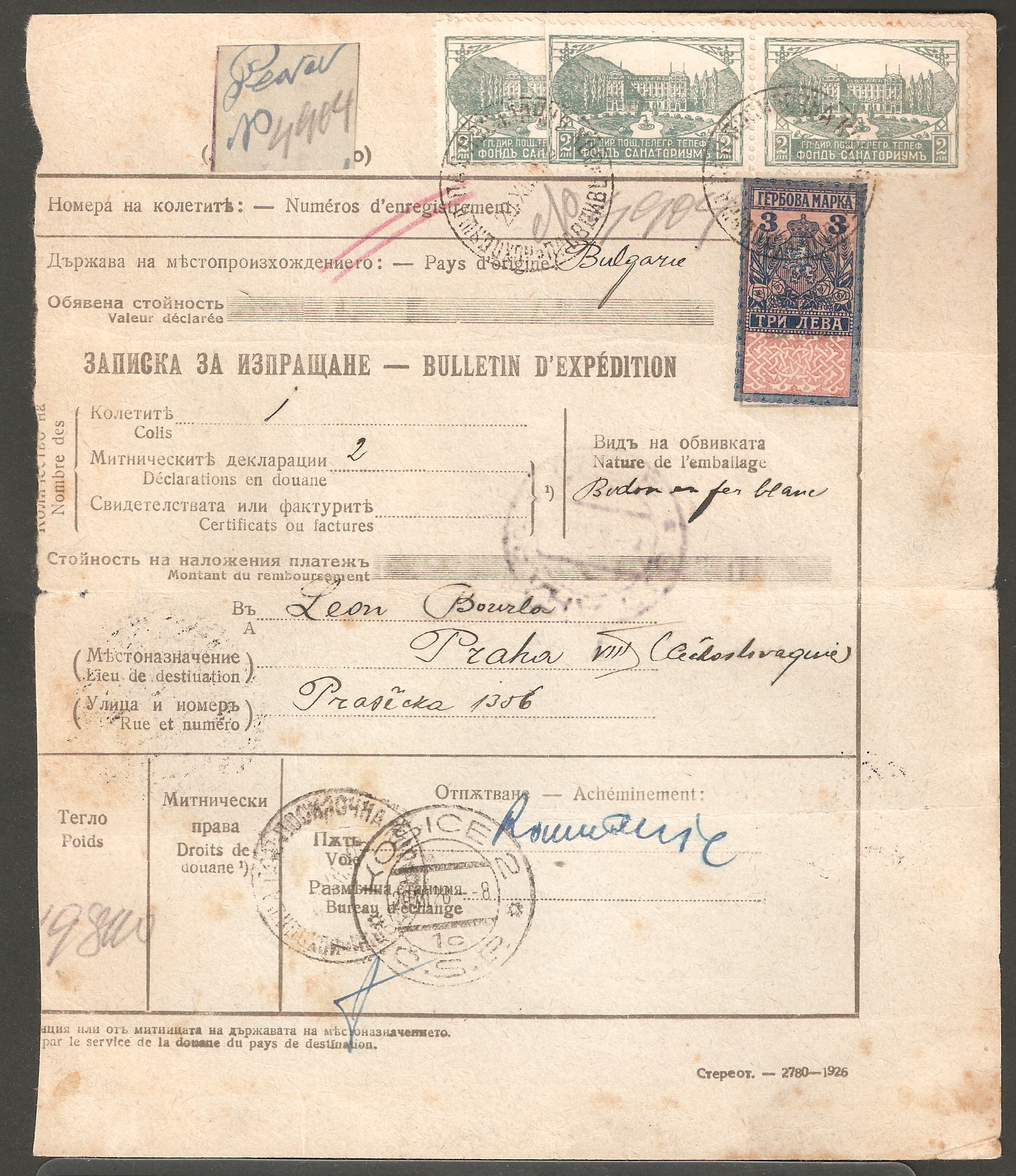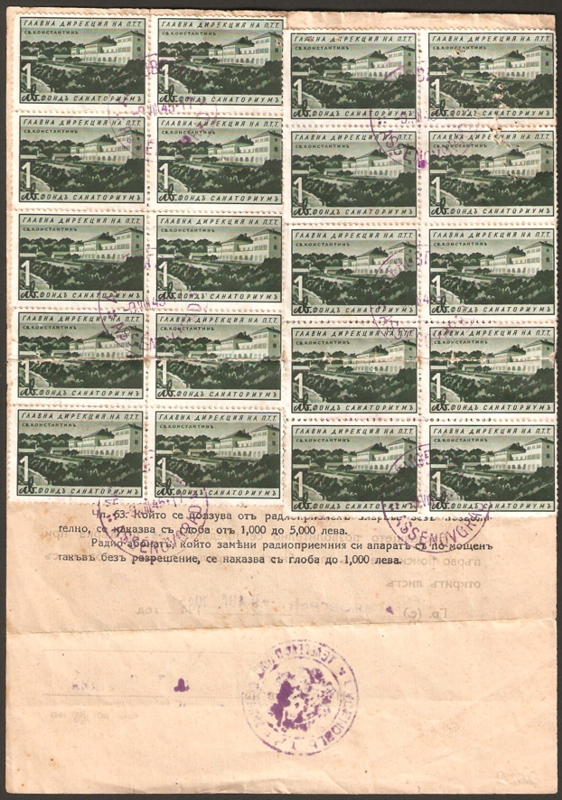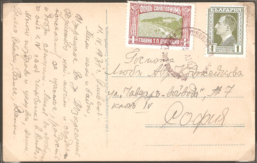 Es handelt sich zum einen um eine am 09.02.1935 in einer Auflage von 200.000 Stück erschienene bulgarische Zwangszuschlagsmarke zugunsten der Sanatorien für Post- und Telegraphenbeamte zu 1 Leva, MiNr. FS 13, zum anderen um eine 1936 erschienene Fiskalmarke zu 3 Leva, Barefoot 186. Beide Marken wurden am Empfangsort "Roustshouk" = bulgarisch "РYCE" entwertet.