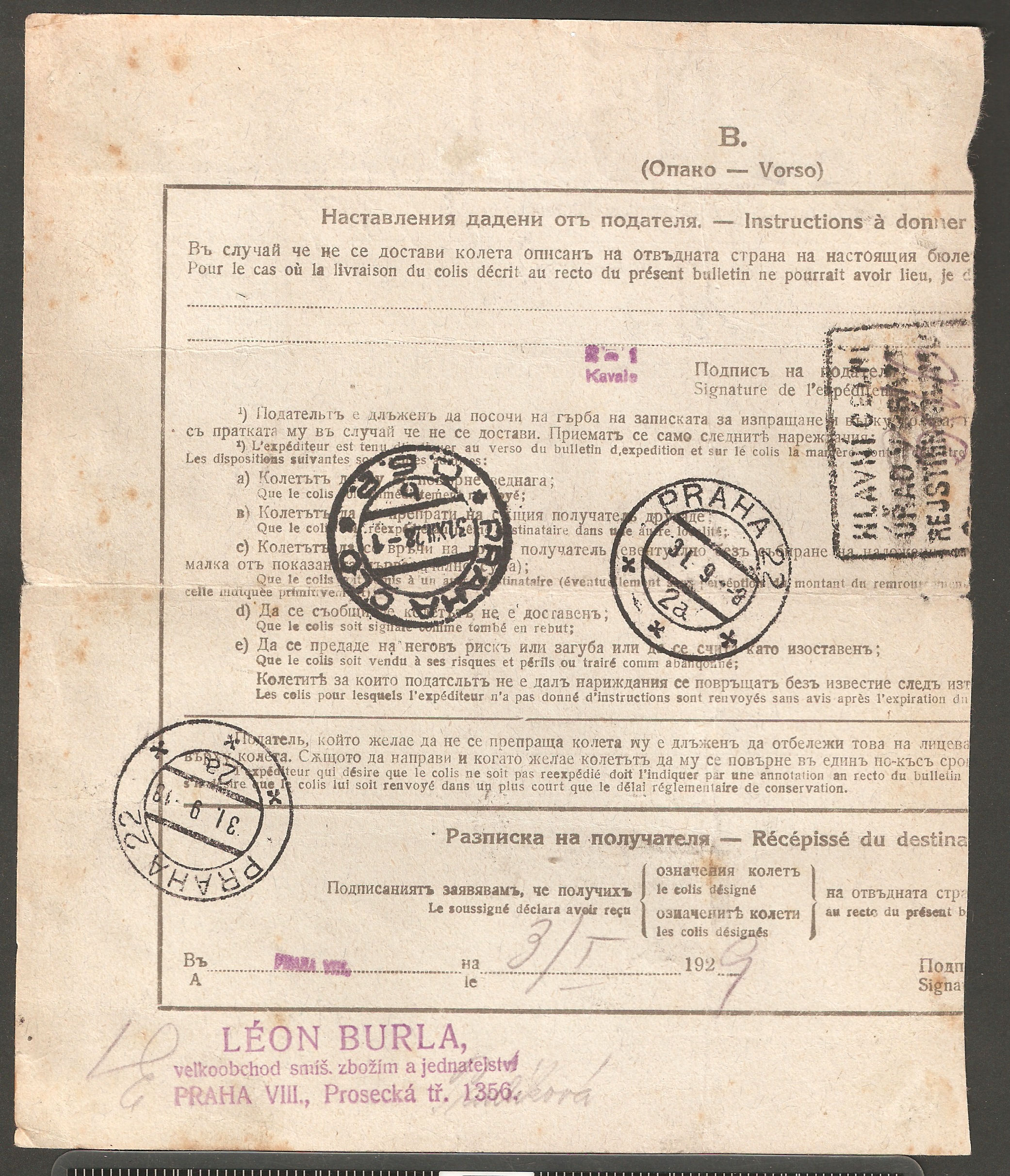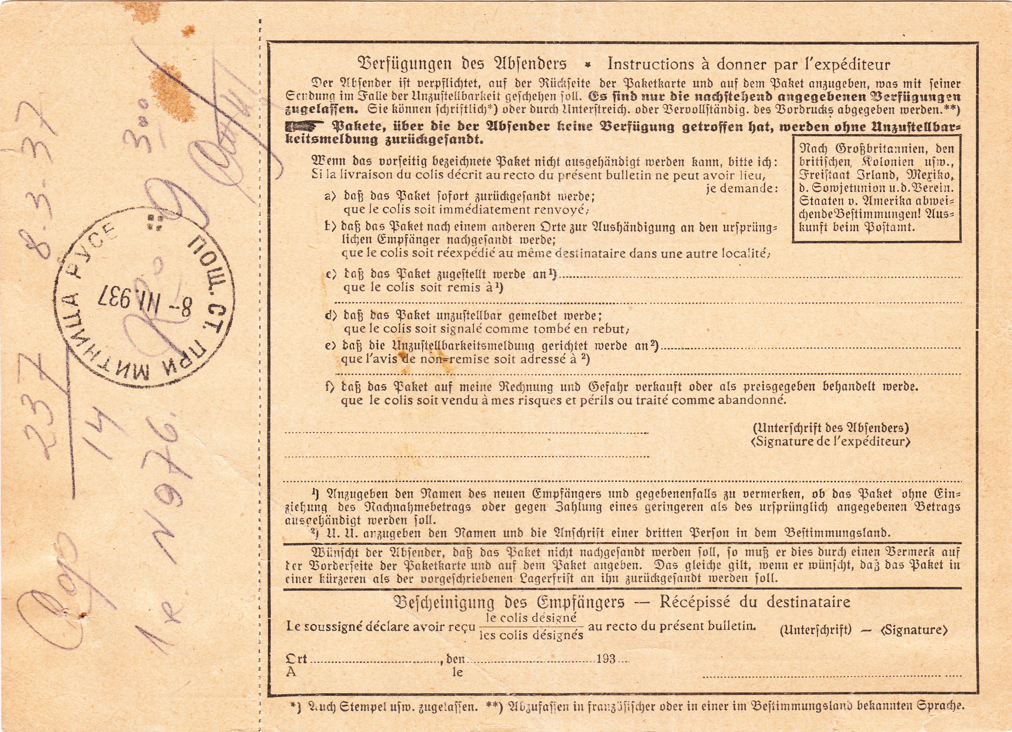 Aufgegeben wurde das zu dieser Paketkarte gehörige Paket mit einem Gewicht von 9.300 g am 27.02.1937 in Leipzig. Das Porto betrug 4,90 RM, wobei die Freimachung per einzeiligem Paket-Postfreistempel in Rot erfolgte, der nach der Ankunft des Paketes in Russe dann am 08.03.1937 teilweise durch die Zwangszuschlagsmarke überklebt wurde.