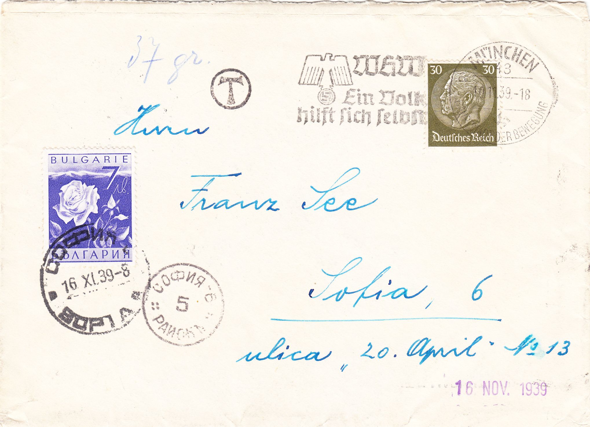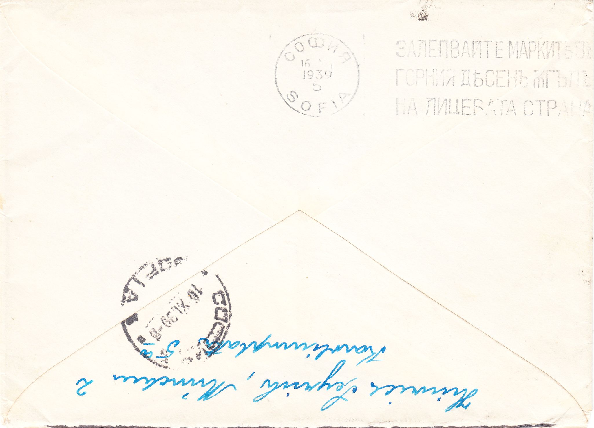 Der Beleg durchlief die für Post aus Bulgarien zuständige Auslandsbriefprüfstelle Wien, wo er linksseitig geöffnet und nach erfolgter Prüfung mit einem neutralen Streifen der Briefverschlussvorrichtung, 20 mm breit, hellbraunes Papier, 45° diagonal geriffelt, Landsmann GV6.2verschlossen wurde, was ein Stempel der Briefverschlussvorrichtung in Rot dokumentiert, v-förmige Blätter, Landsmann GPB1.2, dokumentiert.