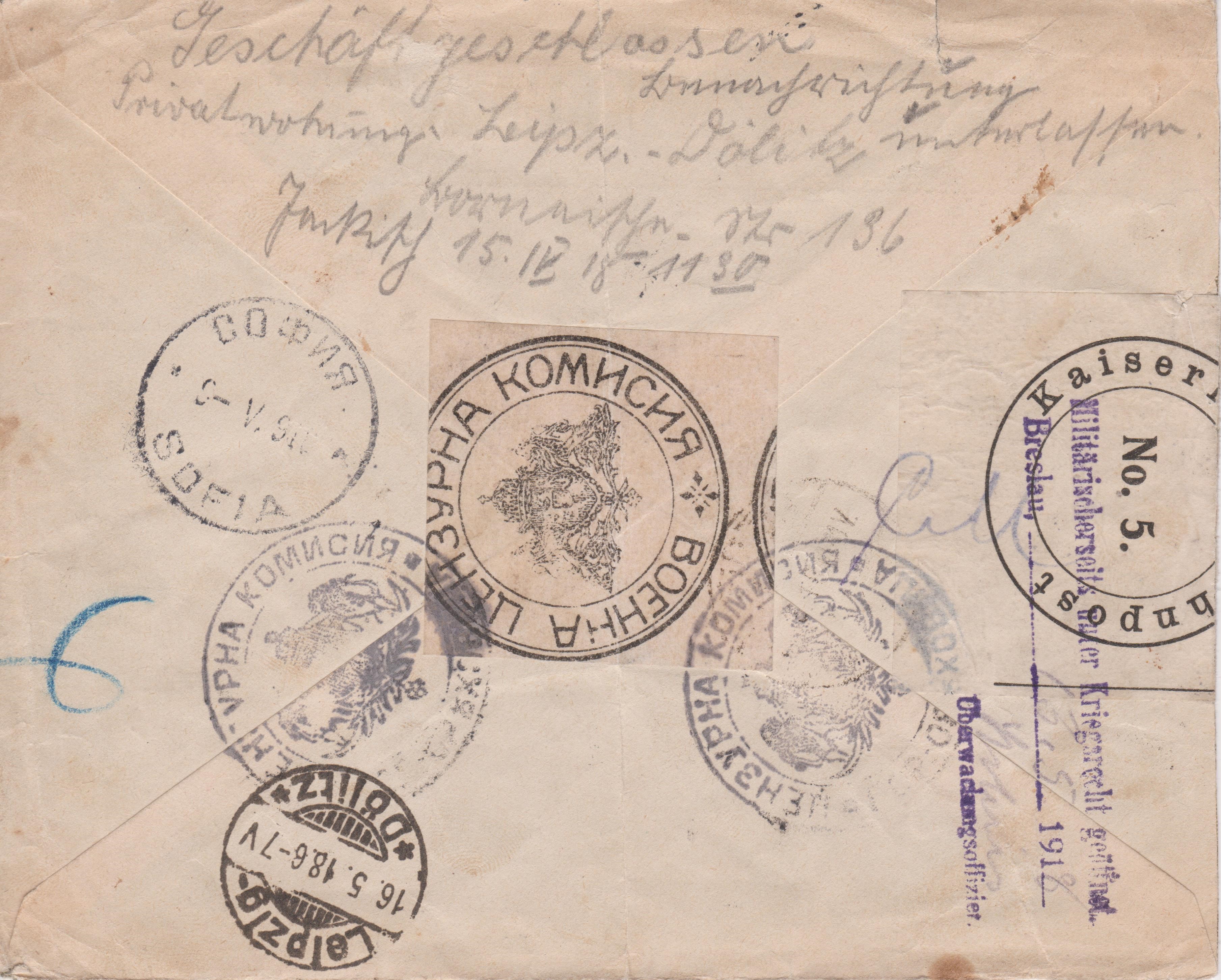 Der Beleg wurde in Breslau laut rückseitigem violettem Stempel oben "Militärischerseits unter Kriegsrecht geöffnet. Breslau 13.5.1918 Überwachungsoffizier" und mit einem Klebezettel "Kaiserliche Bahnpost No. 5." wieder verschlossen. Das in Breslau stationierte Bahnpostamt No. 5 war zuständig für die nach Deutschland führende Bahnstrecke Oderberg-Breslau des Balkanzugs.