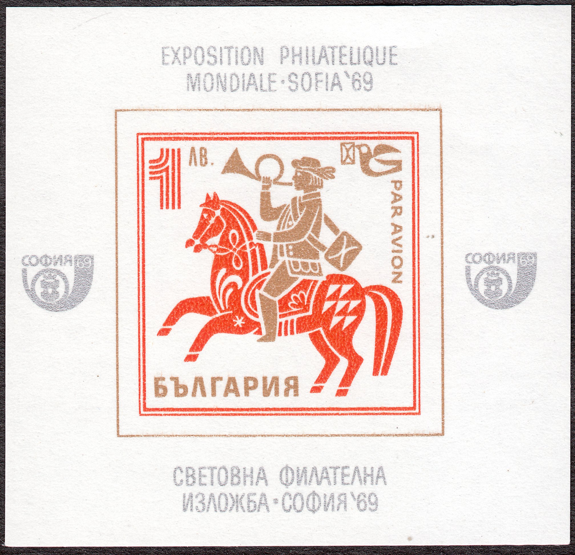 Zur Briefmarken-Weltausstellung 1969 in Sofia erschien in einer Auflage von 100.000 Stück dieser kleine Block im Format 57 x 54 mm, hier ein postfrisches Exemplar: