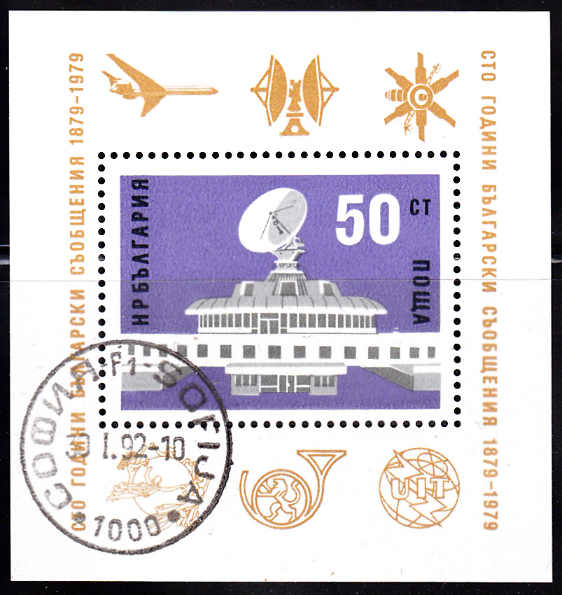 Zum Jubiläum "100 Jahre bulgarisches Postwesen" erschien am 8.Mai 1979 in Bulgarien dieser Block (MiNr Block 88 A). Er enthält eine Marke (MiNr 2775) mit der Darstellung einer Erdfunkstelle.