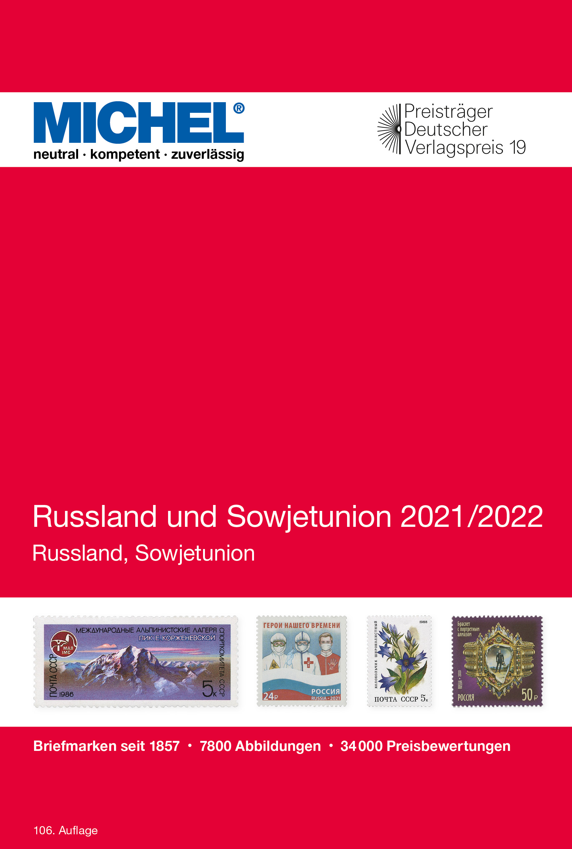 Ebenfalls am 5. November 2021 erschien der Michel Katalog Russland und Sowjetunion 2021/2022 (E 16) in der 106. Auflage in Farbe mit 736 Seiten im Format 155 x 230 mm als Hardcover. Er kostet in Papierversion als Katalog 52,00 €. Er enthält die Ausgaben von Russland (mit Stadtpostmarken, Bürgerkriegspost, RSFSR, Russische Föderation und Auslandspost) und der Sowjetunion.