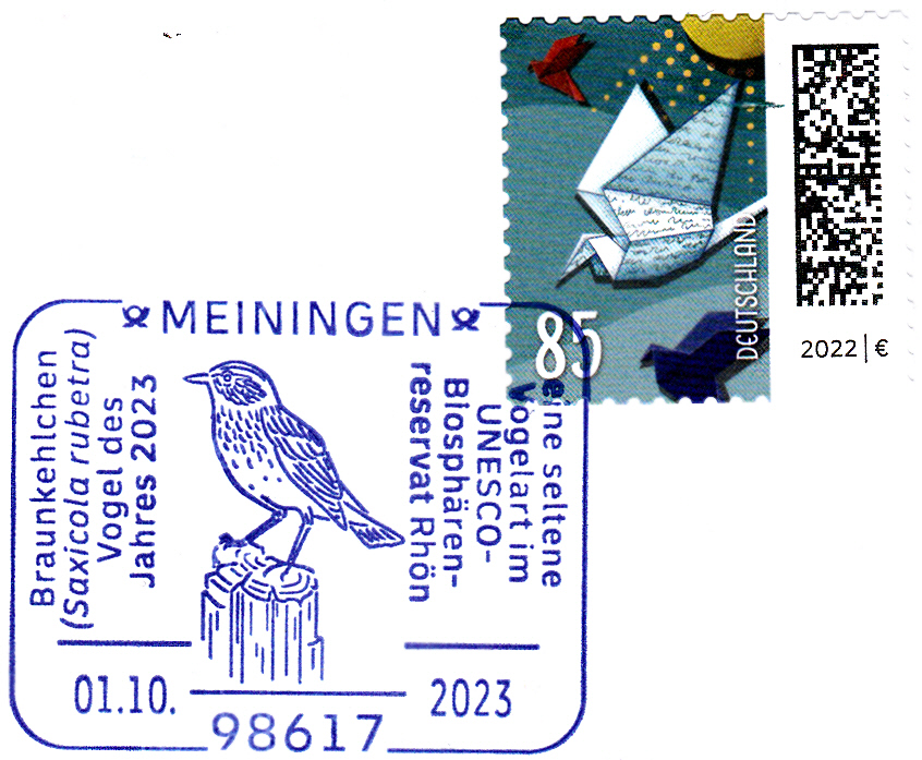 Sonderstempel vom 1.10.2023 aus Meiningen mit einem Braunkehlchen (Saxicola rubetra), dem Vogel des Jahres 2023.