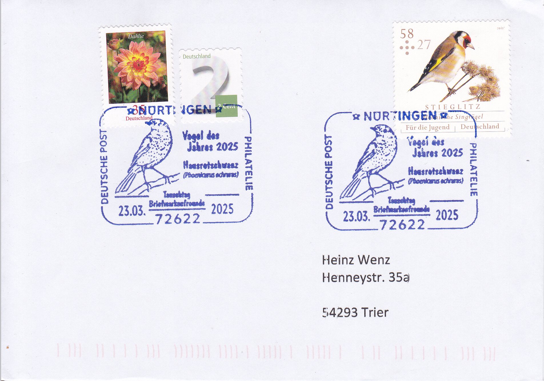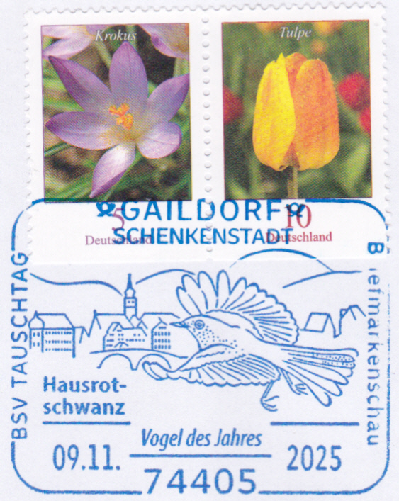 Aus Nürtingen kommt ein weiterer Sonderstempel vom 23.3.2025 mit einem Hausrotschwanz (Phoenicurus ochruros).