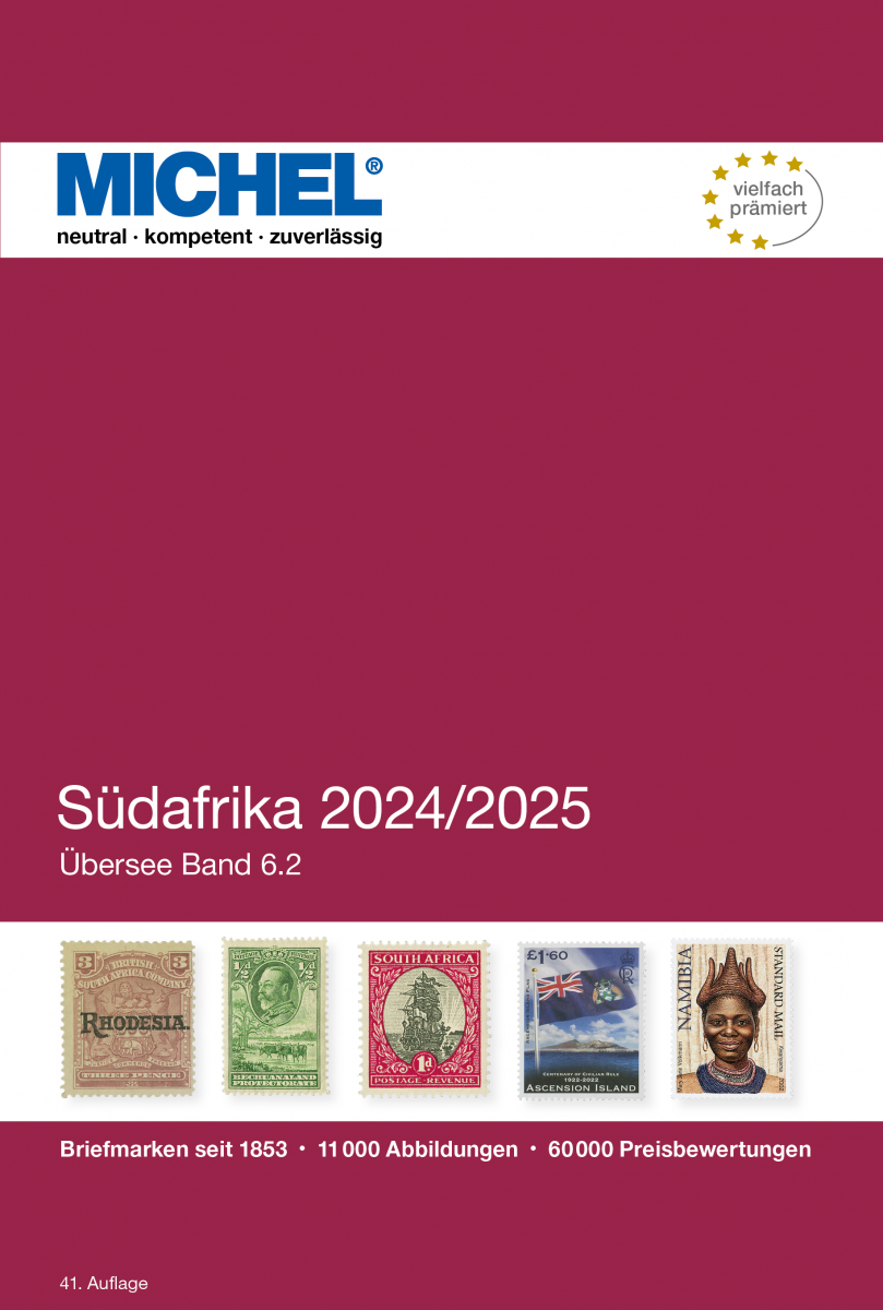 Am 6. September 2024 erschien der neue Michel-Katalog Südafrika 2024/2025 (ÜK 6.2) in der 41. Auflage in Farbe mit 780 Seiten im Format 155 x 230 mm im Festeinband mit Lesebändchen. Er kostet in Papierform als Katalog 98,00 € und in der MICHEL-Online-Bibliothek 69,00 € (um E-Book-Abo 49.00€). Er enthält die folgenden Gebiete: Ascension, Botswana, Lesotho (mit Basutoland), Malawi (mit Nyassaland), Namibia (mit Südwestafrika), Sambia (mit Nord-Rhodesien), St. Helena, Simbabwe (mit Süd-Rhodesien, Rhodesien), Südafrika mit Kolonien und Homelands, Swaziland, Tristan da Cunha.