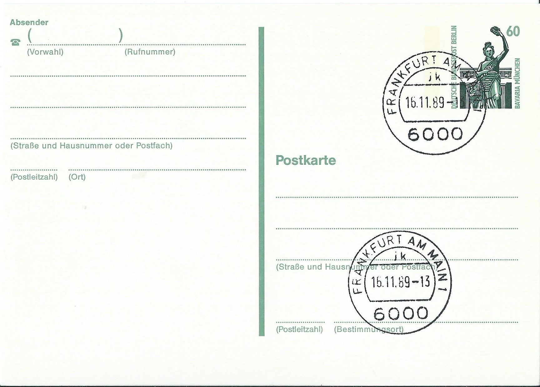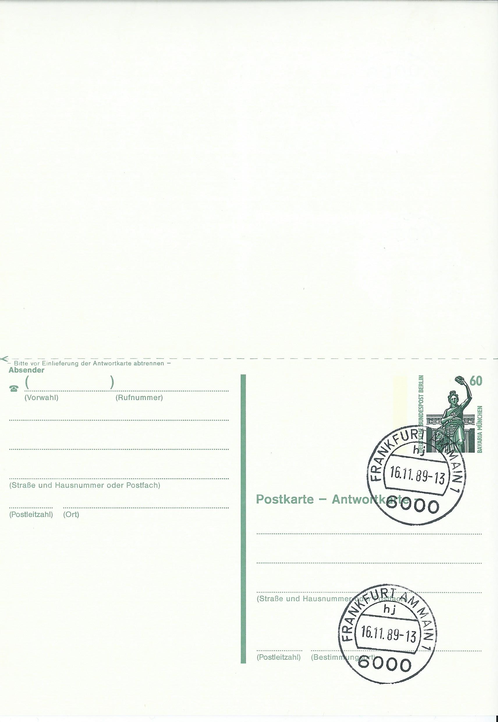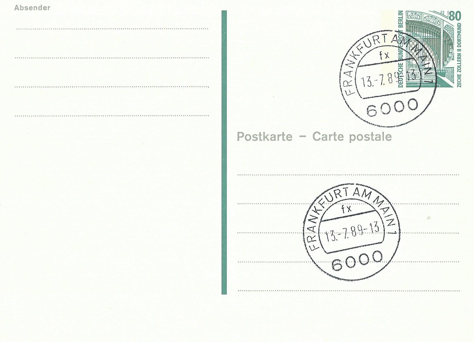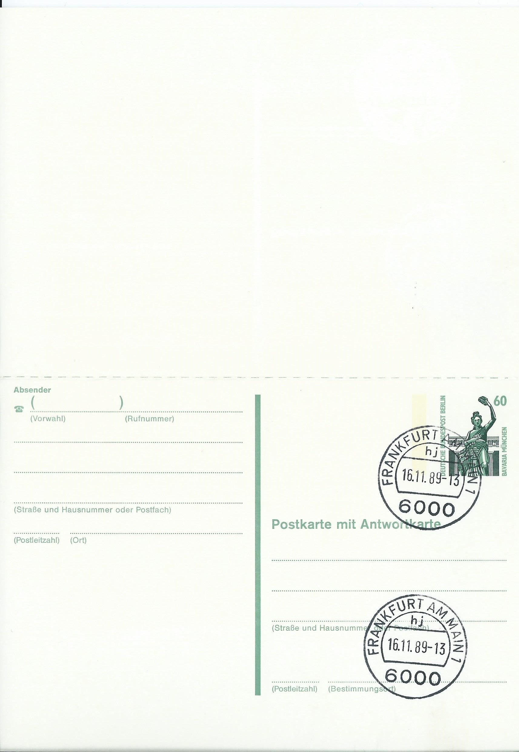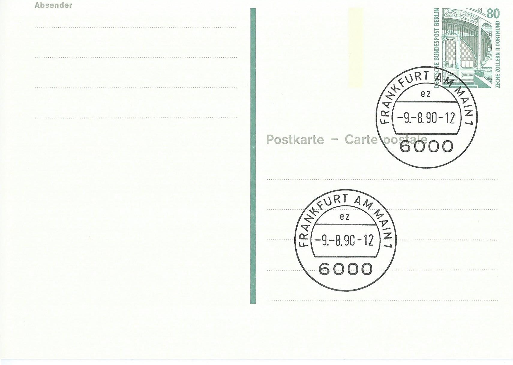 hier kann ich eine weitere Postkarte zu 40 Pf zeigen: Zuerst habe ich gedacht, es handelt sich um eine Privatganzsache, da links im Feld der Schmuckzudruck angebracht wurde. Aber bei genauerem Hinsehen erkennt man unter dem oberen Zudruck noch die Originalbedruckung „Absender“ und die entsprechenden Spalten. Also handelt es sich um einen privaten Zudruck, den sicherlich ein Händler veranlasst hat, um die Postkarte zu einem höheren Preis an seine Kundschaft zu verkaufen. Na ja, der Anlass ist ja auch Geschichte pur: 1. Juli 1990, Inkrafttreten der Währungs- Wirtschafts- und Sozialunion Bundesrepublik – DDR. Gestempelt wurde mit einem entsprechenden Sonderstempel in Berlin am 1.7.90: