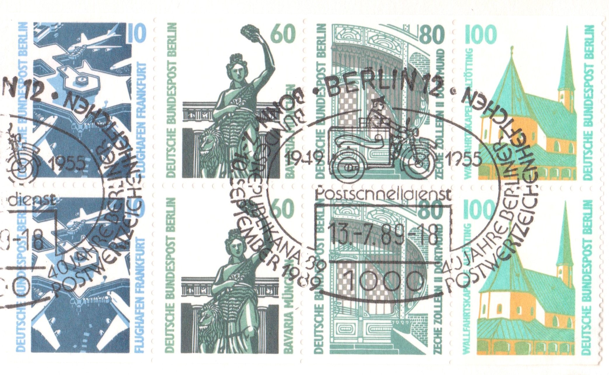Dieses Beispiel "Kartonphilatelie" zeigt den Plattenfehler Berlin MiNr. 798 I auf Feld 1, also der ersten Marke links oben. Hier ist die Laterne auf dem Terminaldach nur in der Farbe Hellblau gedruckt worden statt normal in Dunkelblau: