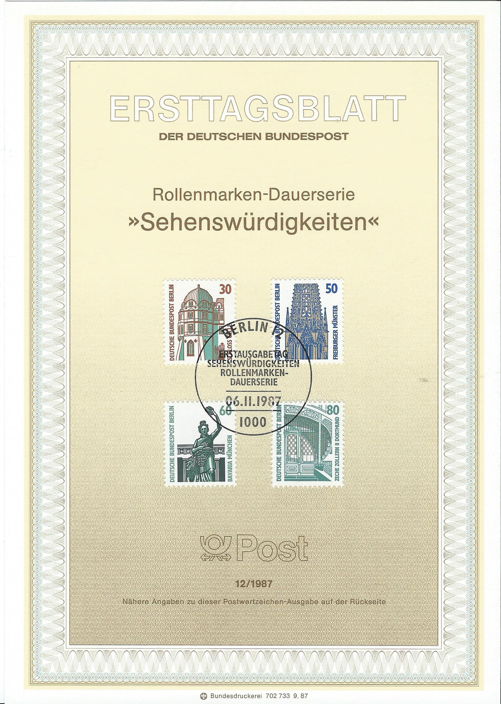 Das erste Blatt enthält die Werte zu 30, 50, 60 und 80 Pf, welche am 6.11.87 erschienen sind. Gestempelt wurde mit dem Ersttagsonderstempel von Berlin.