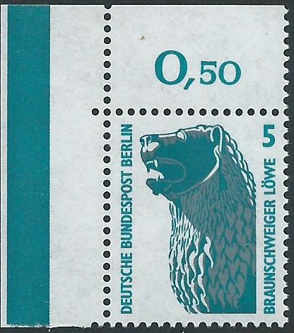 ein postfrisches linkes oberes Eckrandstück zu 5 Pf mit entsprechendem Reihenwertzähler und dem charakteristischen senkrechten Farbbalken im linken Seitenrand:
