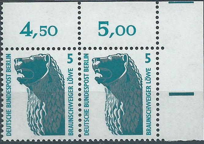 ein postfrisches waagerechtes Paar aus der rechten oberen Bogenecke zu 5 Pf mit entsprechenden Reihenwertzählern und den charakteristischen waagerechten Standstrichen im rechten Seitenrand: