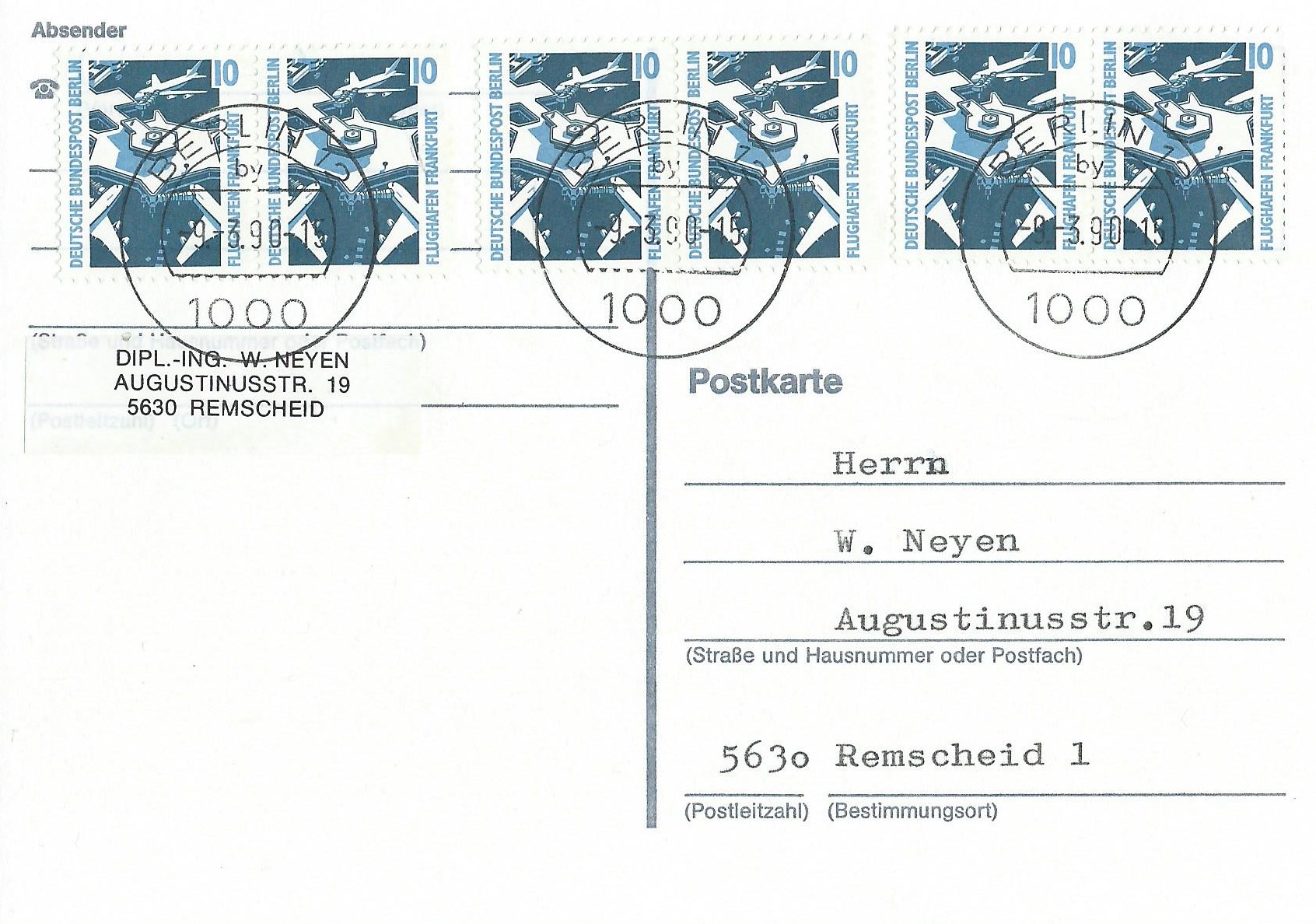 hier kommt ein Beleg, der gleich in 2 Wertstufen passt: Einmal zur 10 Pf und einmal zur 60 Pf-Marke. Von der 10 Pf-Marke sind ein waagrechtes und ein senkrechtes Paar verklebt worden, letzteres vom Bogenoberrand mit Reihenwertzähler 8,00 sowie ein Oberrandstück 60 Pf mit Reihenwertzähler 36,00. Gestempelt wurde der Beleg mit einem Sonderstempel von Frankfurt am Main am 27.9.90.