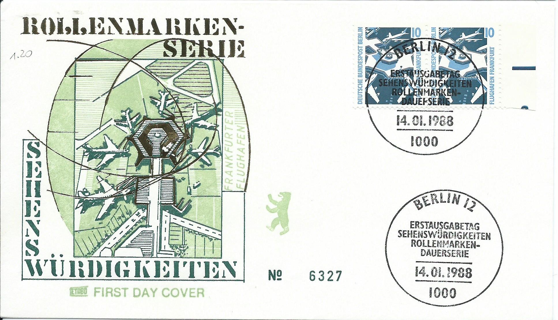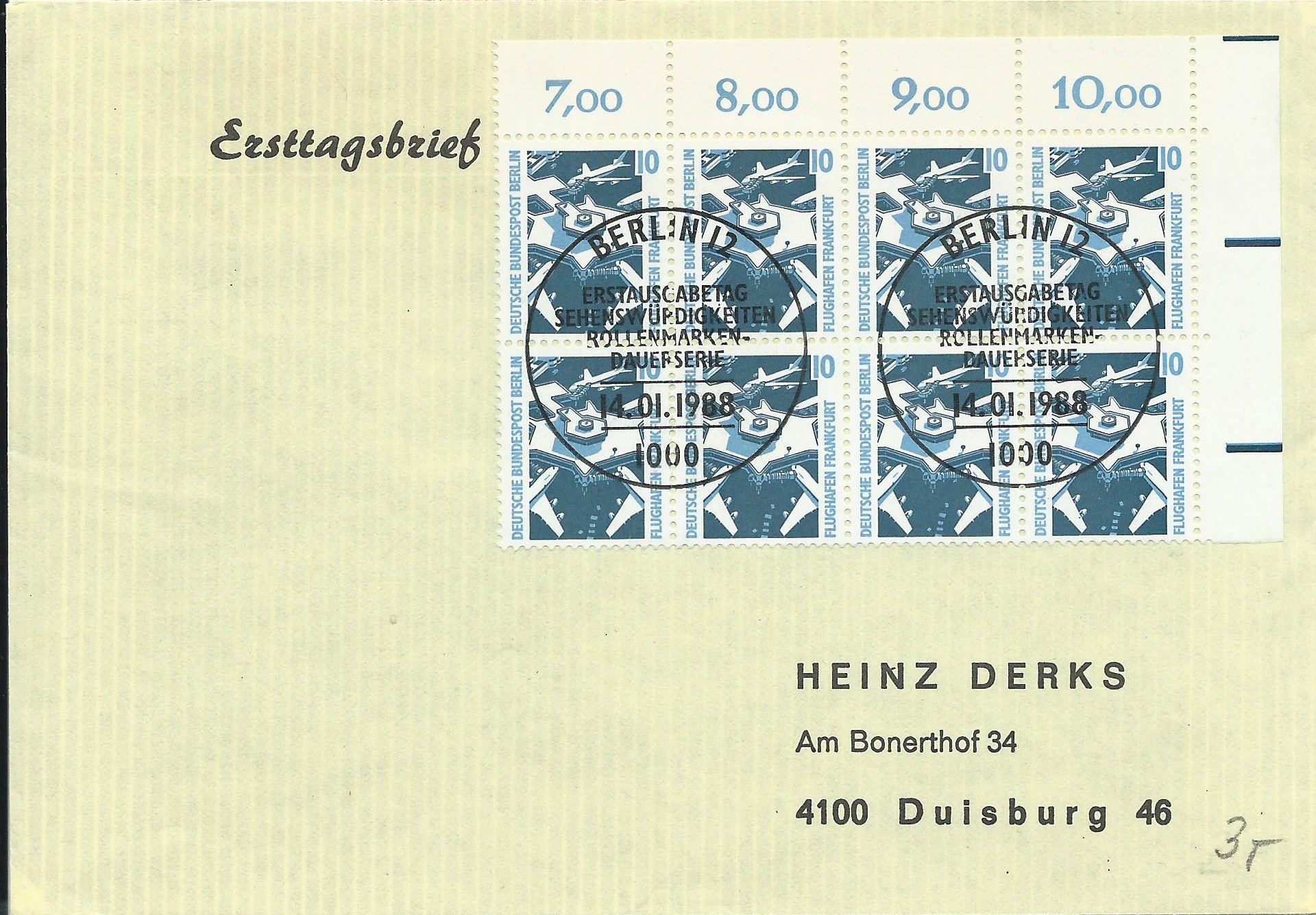 Ersttagsbrief = FDC der Werte zu 10 Pf und 300 Pf der Dauerserie Sehenswürdigkeiten, Ausgabe Berlin, als Kombination von zwei Rollenmarken mit waagerechter rückseitiger Nummer sowie von Bogenmarken mit anhängendem Oberrand.
