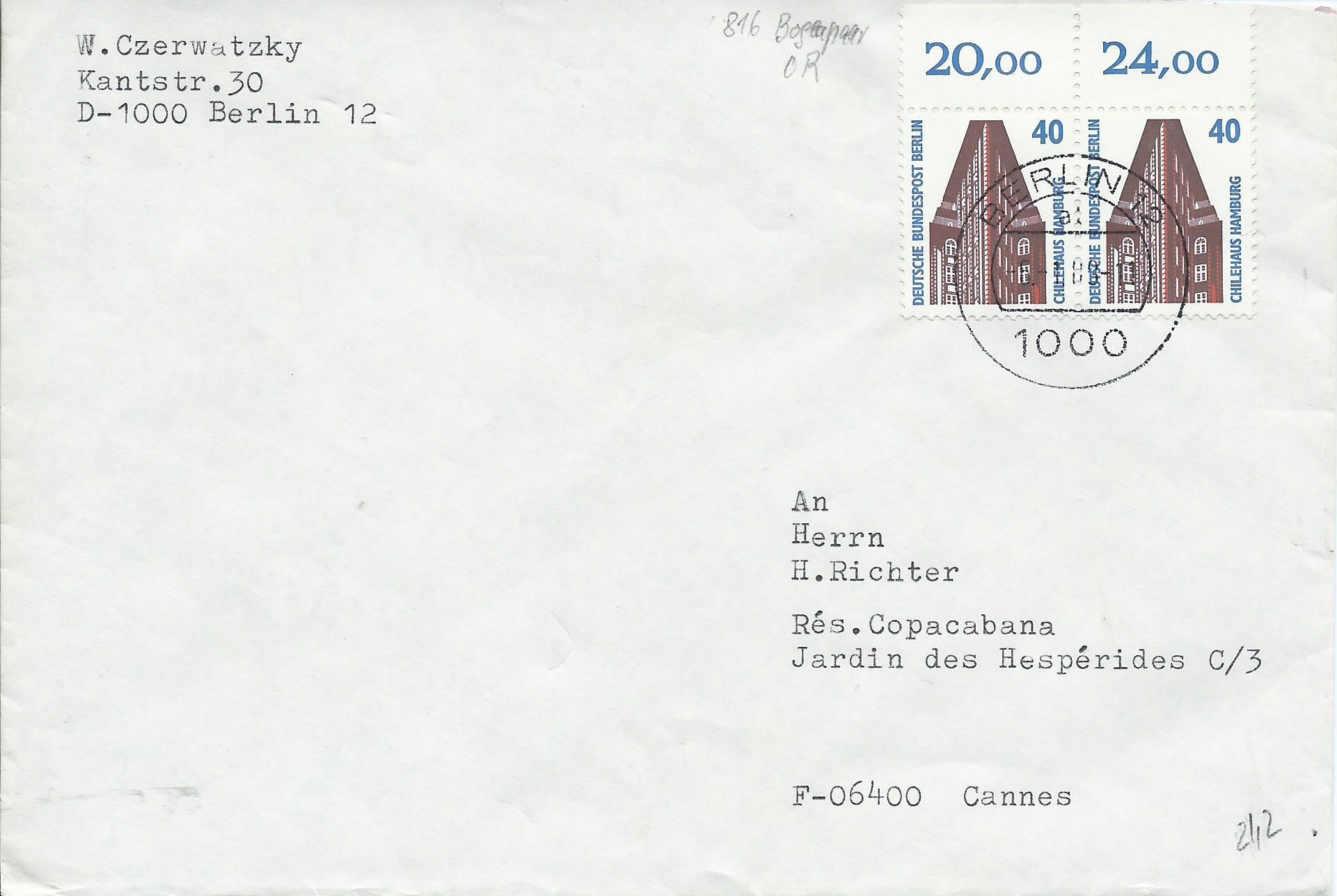 Brief von 21-50 g (170 Pf), aufgegeben am 23.08.88 in Berlin, adressert nach Konz, als Fernbrief entsprechend portogerecht freigemacht mit 130 Pf in Form einer Mischfrankatur bestehend aus einem Paar des 40 Pf Wertes SWK, Ausgabe Berlin, sowie einer Berliner Sondermarke.