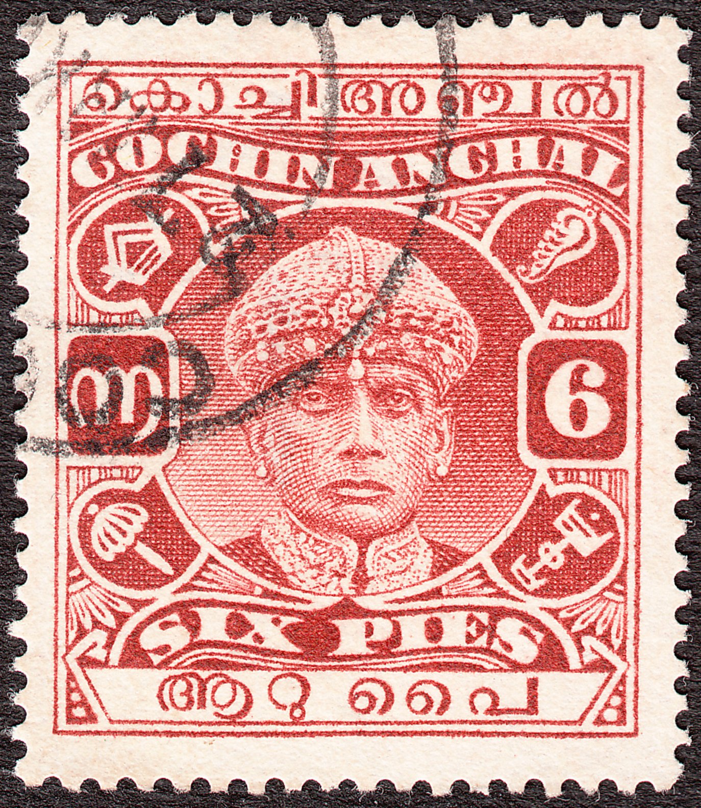 Die MiNr. 44 zu 6 Pies in braunrot zeigt ein Kopfbild des Maharadscha Rama Varma (III.), der in Cochin von 1932 bis 1941 regierte: