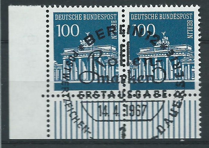 Hier ein Beleg mit einem 8-er-Block vom linken Seitenrand Brandenburger Tor 10 Pf, dazu ein senkrechtes Paar 10 Pf Burgen und Schlösser aus Markenheftchen (oben und unten geschnitten), gestempelt Berlin 12 am 31.12.91. Das ist ein Letzttagsbeleg des Sammelgebietes Berlin, da an diesem Tag die Gültigkeit der Ausgaben "Deutsche Bundespost Berlin" endet. Ab dem 1.1.92 waren in ganz Deutschland nur noch die Ausgaben der (damaligen) Deutschen Bundespost gültig.