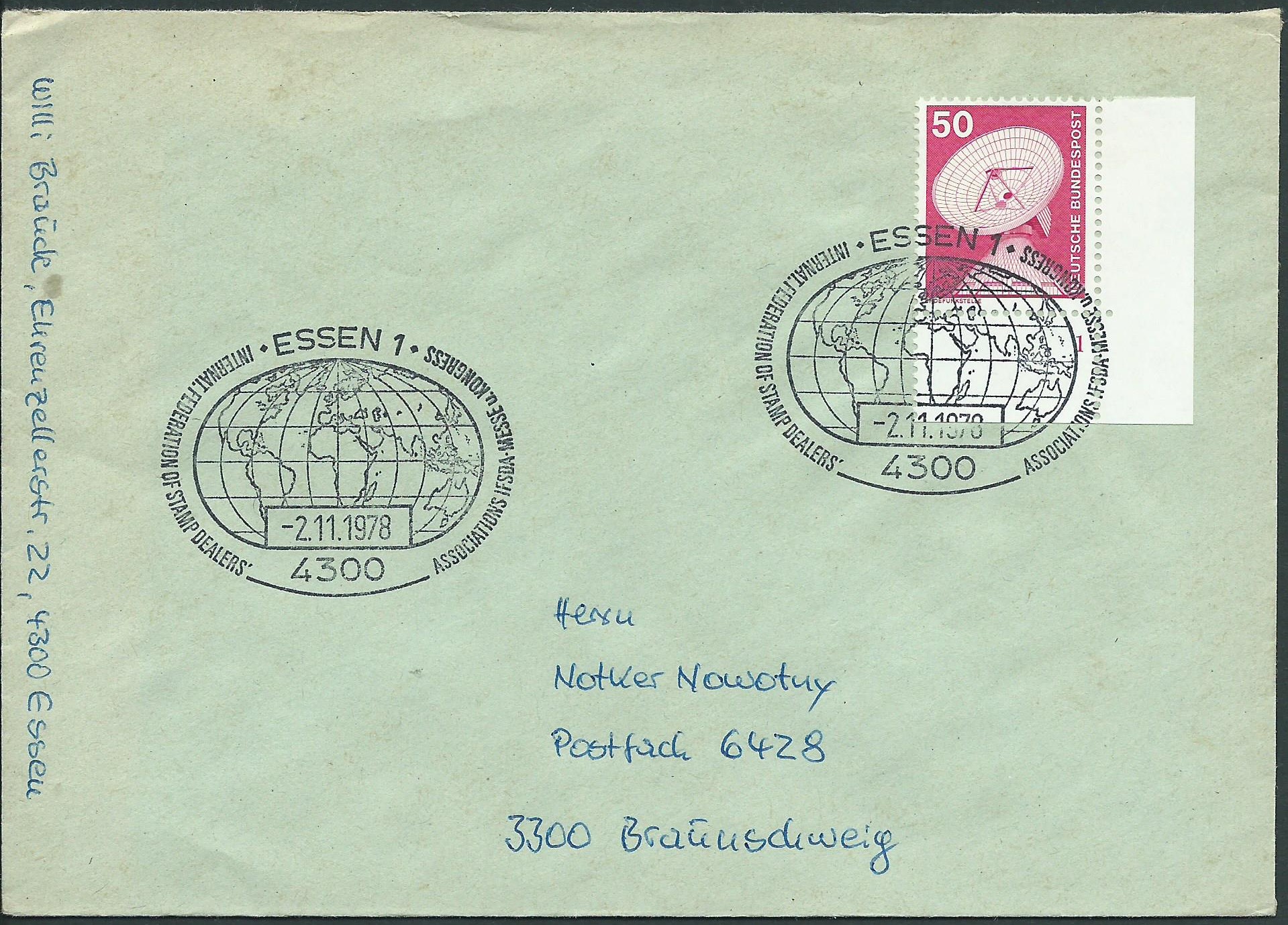 Und noch eine Einzelfrankatur hinterher: Industrie und Technik 50 Pf (Mi.Nr. 851) als rechte untere Bogenecke mit Formnummer 1 auf Standartbrief, gestempelt mit Sonderstempel in Essen am 2.11.78.