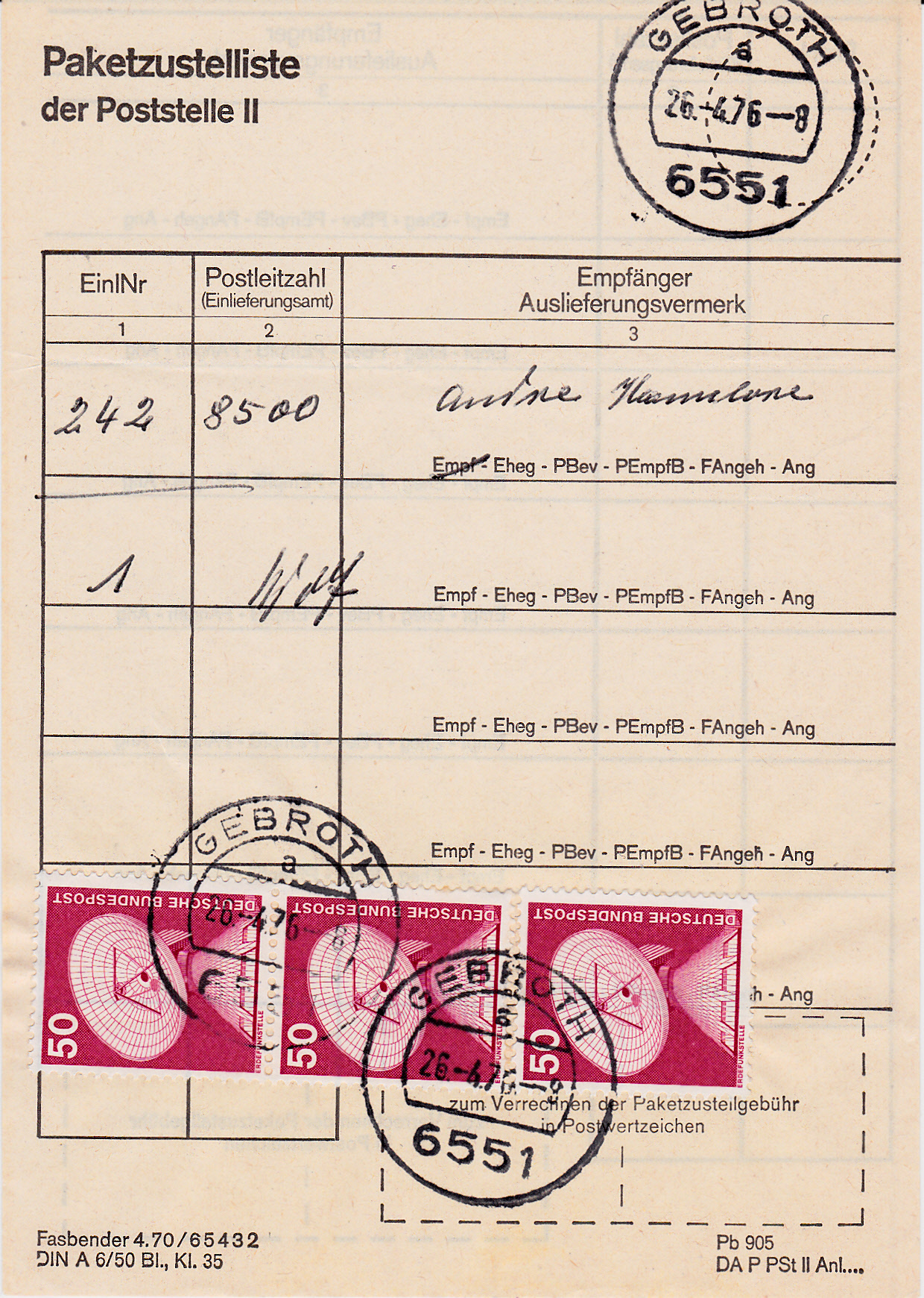 Paketzustellliste der Poststelle II in 6551 Gebroth vom 26.4.1976 mit einem Dreierstreifen des 50Pf-Wertes der DS Industrie und Technik (MiNr 851) zur Verrechnung der Paketzustellgebühr in Höhe von 1,50 DM für ein Paket.