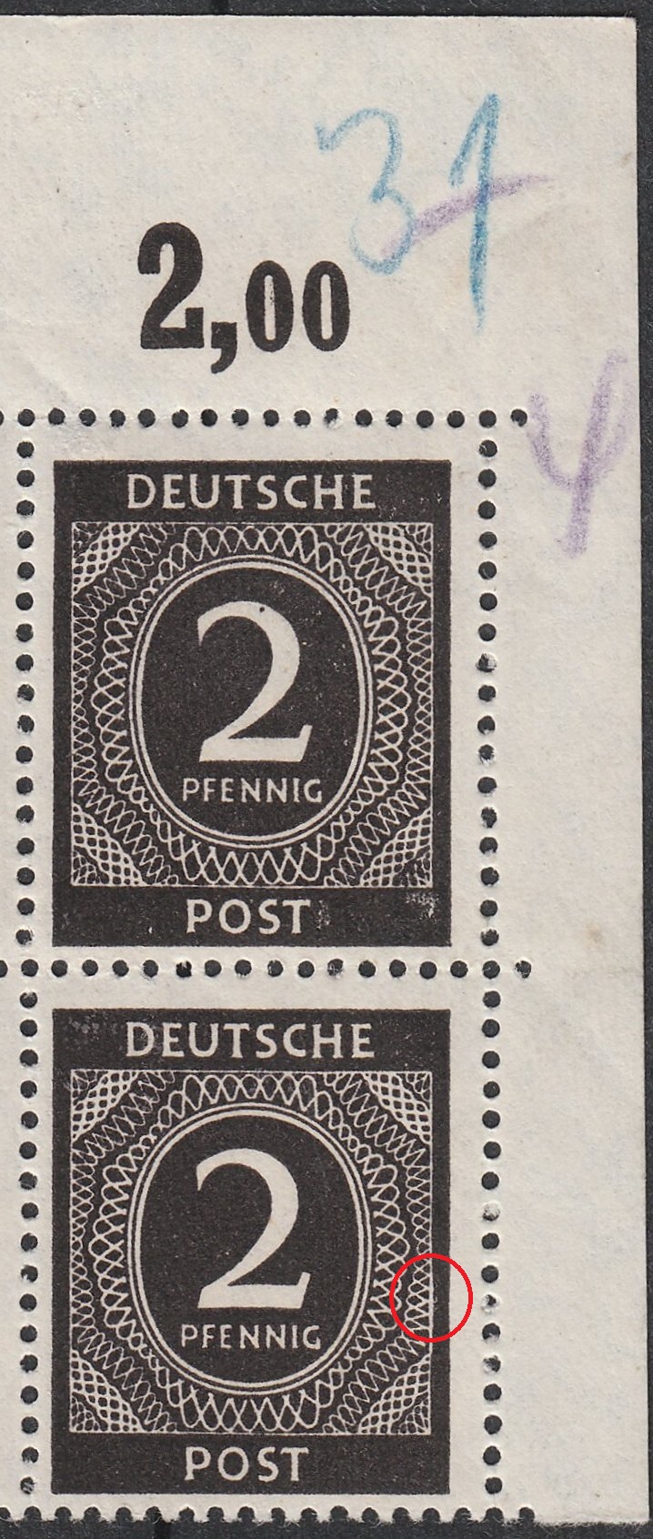 Auf Feld 1 = Eckrand 1 = linke obere Bogenecke kommt bei HAN 4082-46.1 sowie HAN 4118-46.1 in der Reihenwertziffer im Oberrand der Plattenfehler "0 vor dem Komma beschädigt" vor: