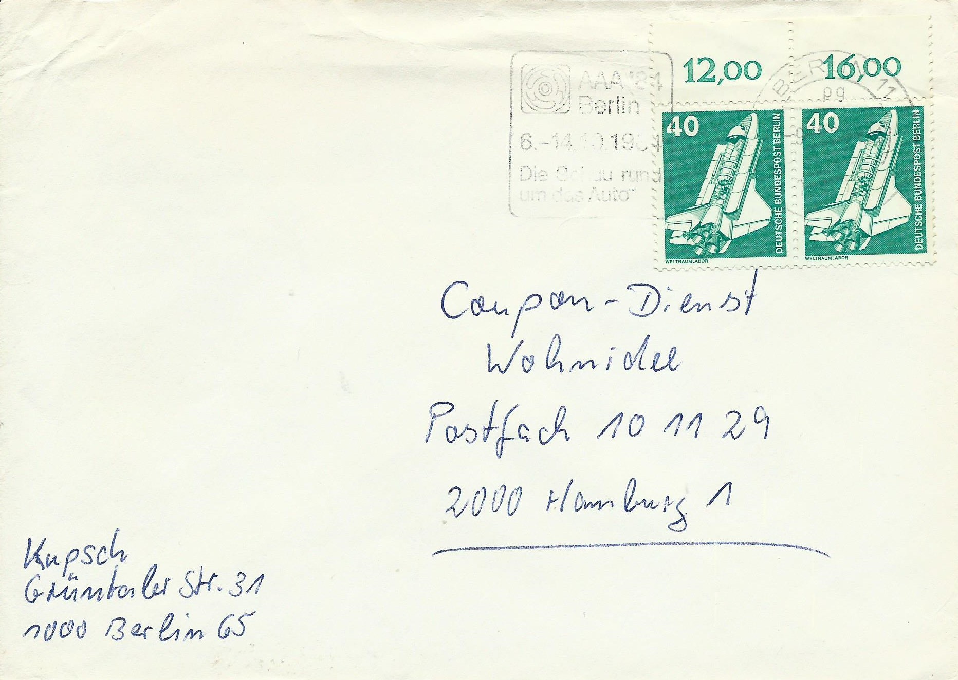 Der Wert zu 40 Pf als waagerechtes Paar vom Oberrand mit Reihenwertzählern 12,00 und 16,00 auf einem Standartbrief. Gestempelt wurde er am 9.12.84 in Berlin 11.