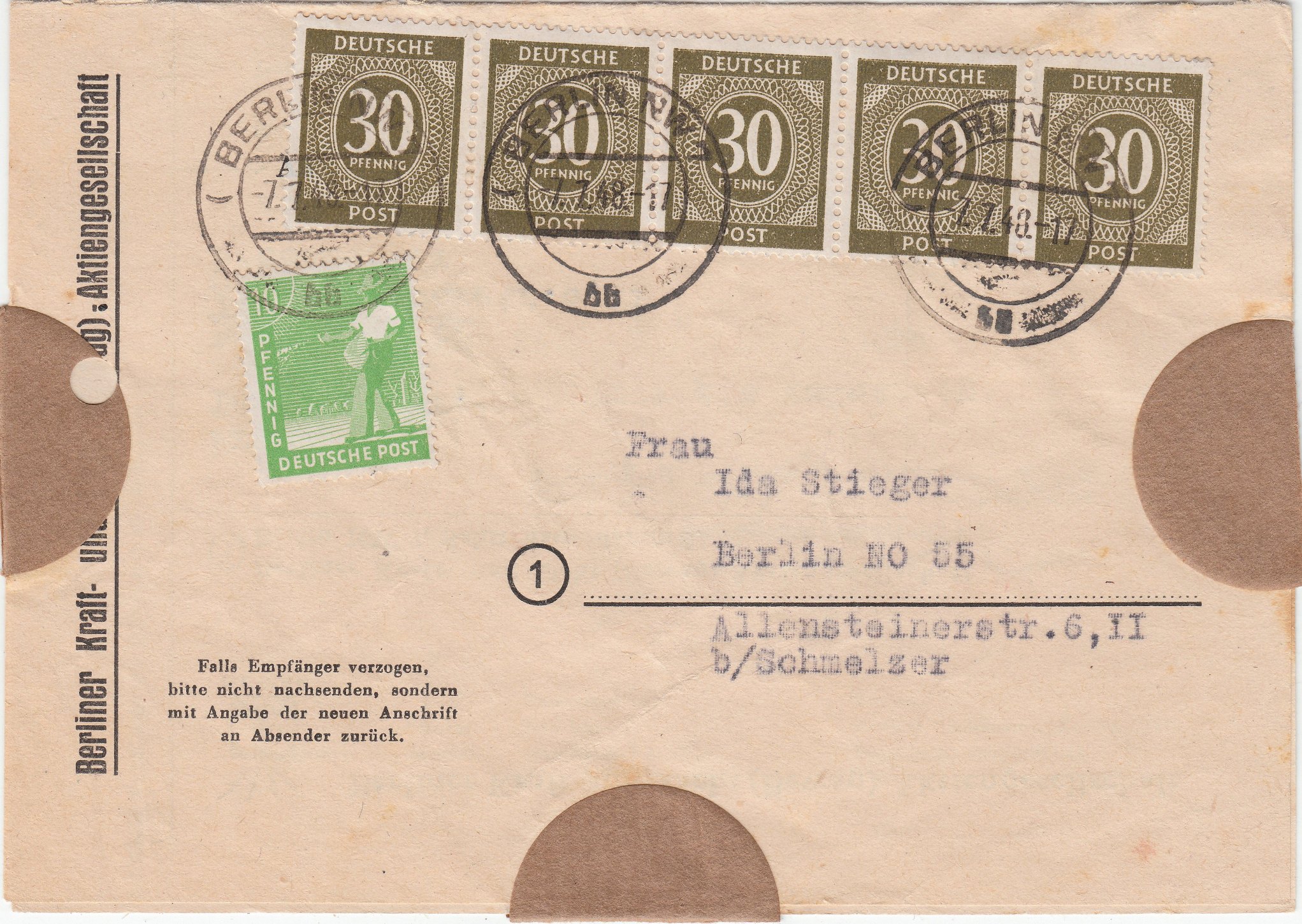 Zehnfachfrankatur von fünf 30 Pf Marken der Ziffernserie sowie einem 10 Pf Wert der Arbeiterserie am 07.07.1948 portorichtig in BERLIN NW 7. In der Sowjetischen Zone sowie im Ostteil von Berlin waren solche Zehnfachfrankaturen bis zum 31.07.1948 gültig: