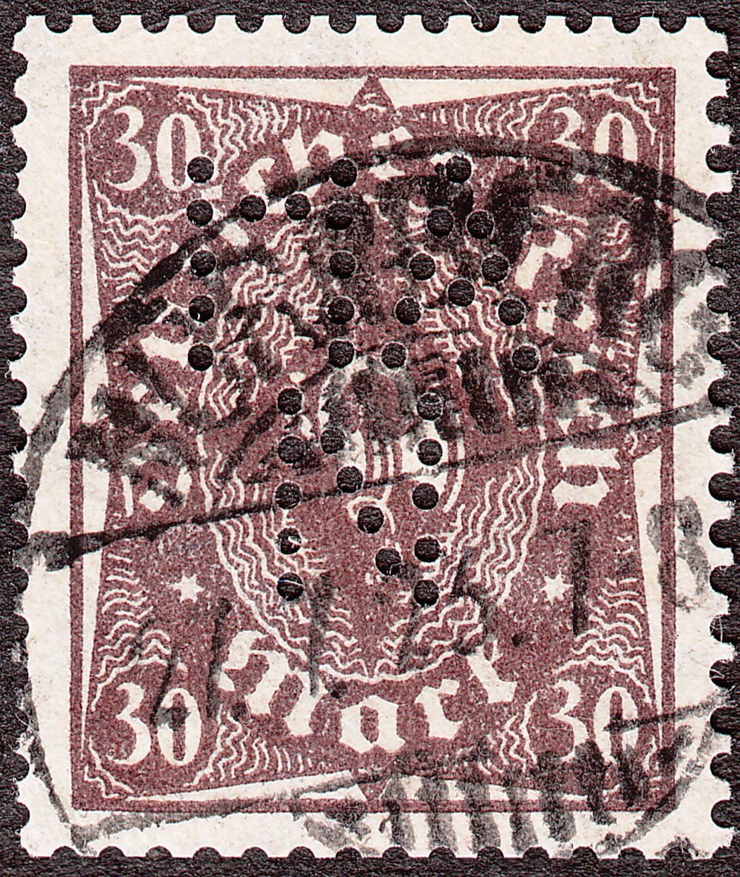 Die Marke in der Farbe "b" zeigt eine Firmenlochung "MAN" = Maschinenfabrik Augsburg-Nürnberg und wurde dementsprechend in NÜRNBERG gestempelt.