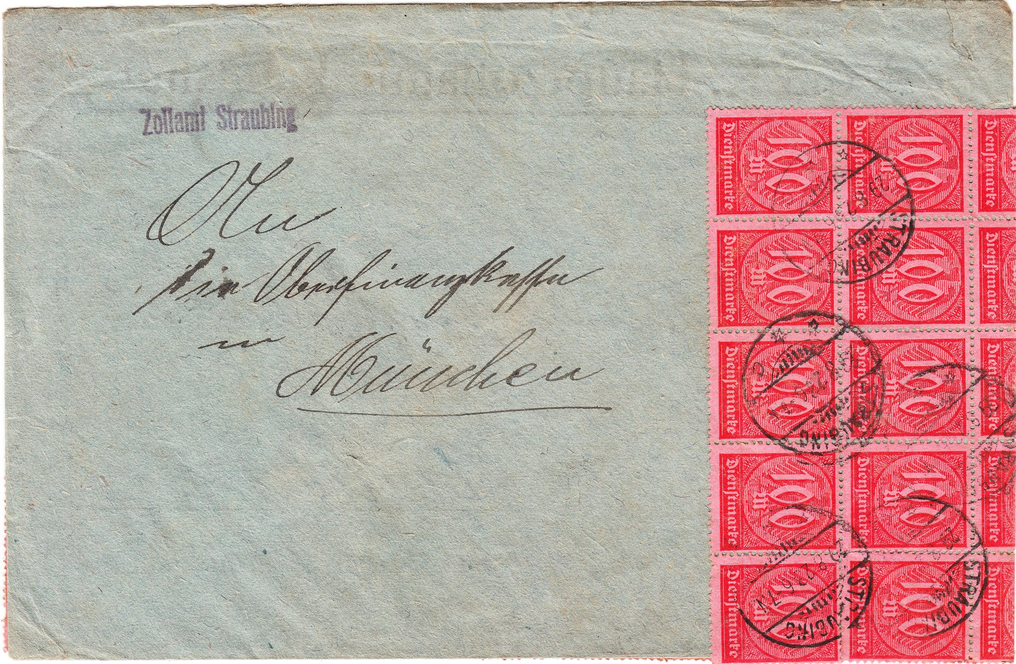 Dieser "An die Oberfinanzkasse in München" adressierte Brief trägt einen Absenderstempel "Zollamt Straubing" und ist frankiert mit einem Fünfzigerblock der DR Dienst MiNr. 74, der am 29.08.1923 gestempelt wurde: