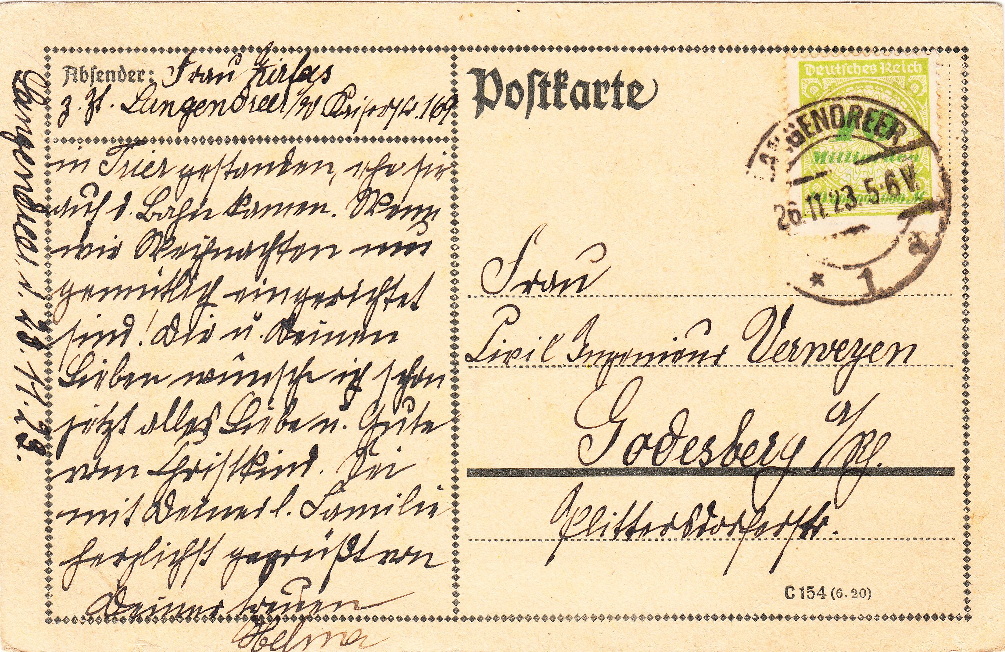 Während der kurzen Zeitspanne vom 12.11.1923 bis zum 19.11.1923, also ganze 8 Tage lang, galt für eine Postkarte im Fernverkehr die hier am 15.11.1923 als Einzelfrankatur mit einer MiNr. 327 B P dargestellte Portostufe von 5 Milliarden Mark: