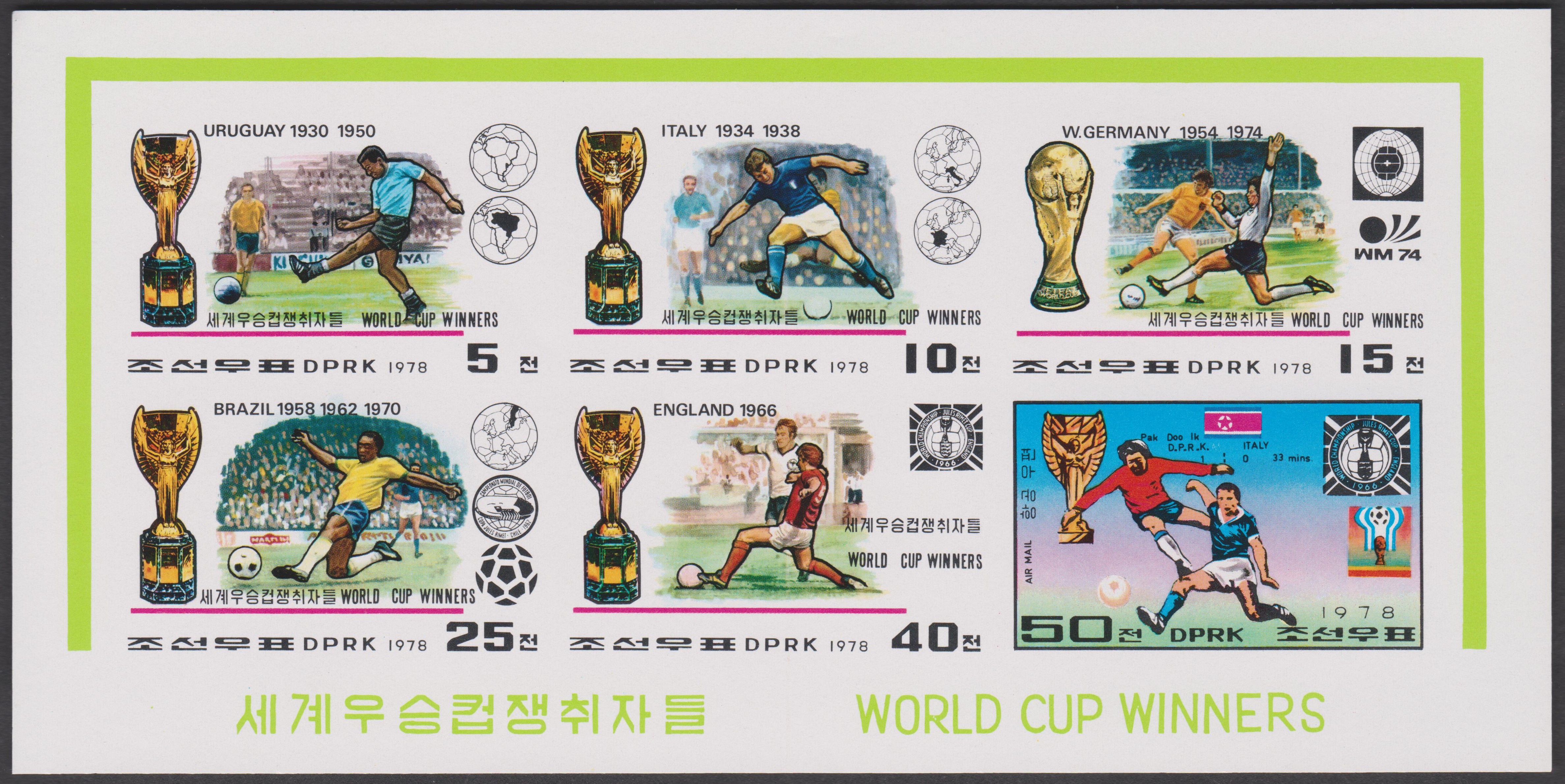 In Nordkorea erschien aus Anlass der WM 1978 eine Serie mit allen Weltmeistern von 1930 bis 1974. Hier der Wert zu Ehren der Titelträger von 1930 und 1950.