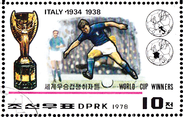Italien wurde zum erstenmal bei der WM 1934 im eigenen Land Weltmeister und konnte diesem Titel auch 1938 in Frankreich verteidigen. Diese Marke aus Nordkorea (MiNr 1748) zur Fußball-WM 1978 würdigt diese beiden Erfolge.