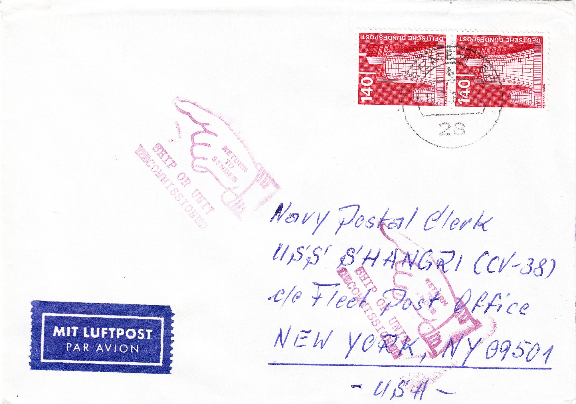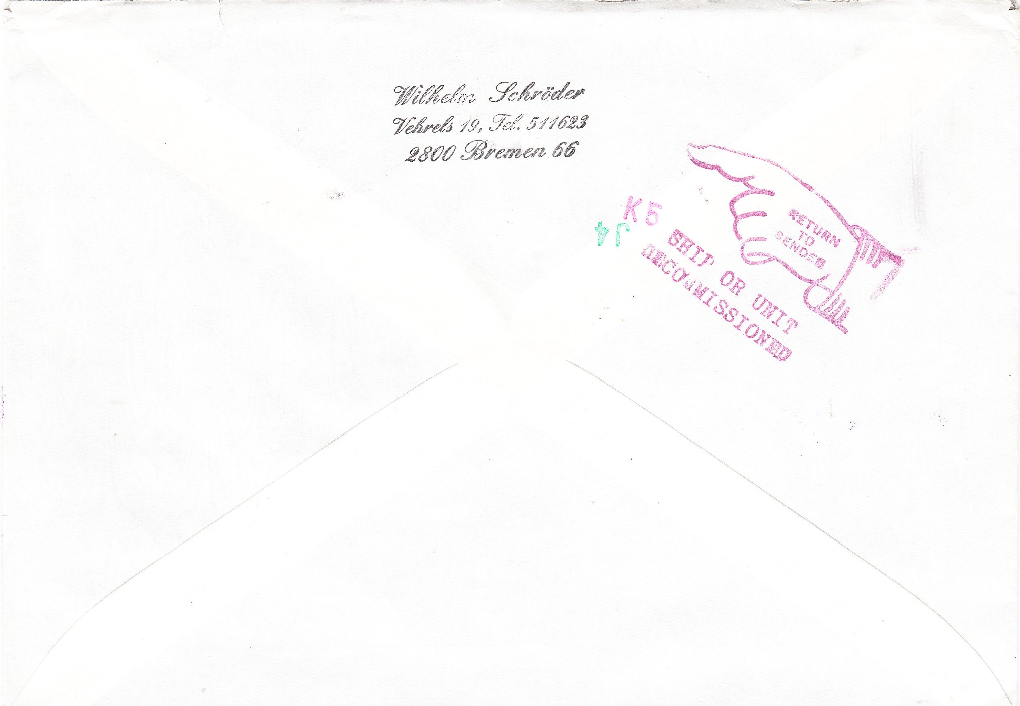Dieser 1982 in Bremen aufgegebene Brief erreichte die längst ausser Dienst gestellte "USS SHANGRI (CV-38)" nicht mehr und wurde daher mit einem speziellen Hinweisstempel "RETURN TO SENDER SHIP OR UNIT DECOMMISSIONED" versehen und an den Absender zurück geleitet: