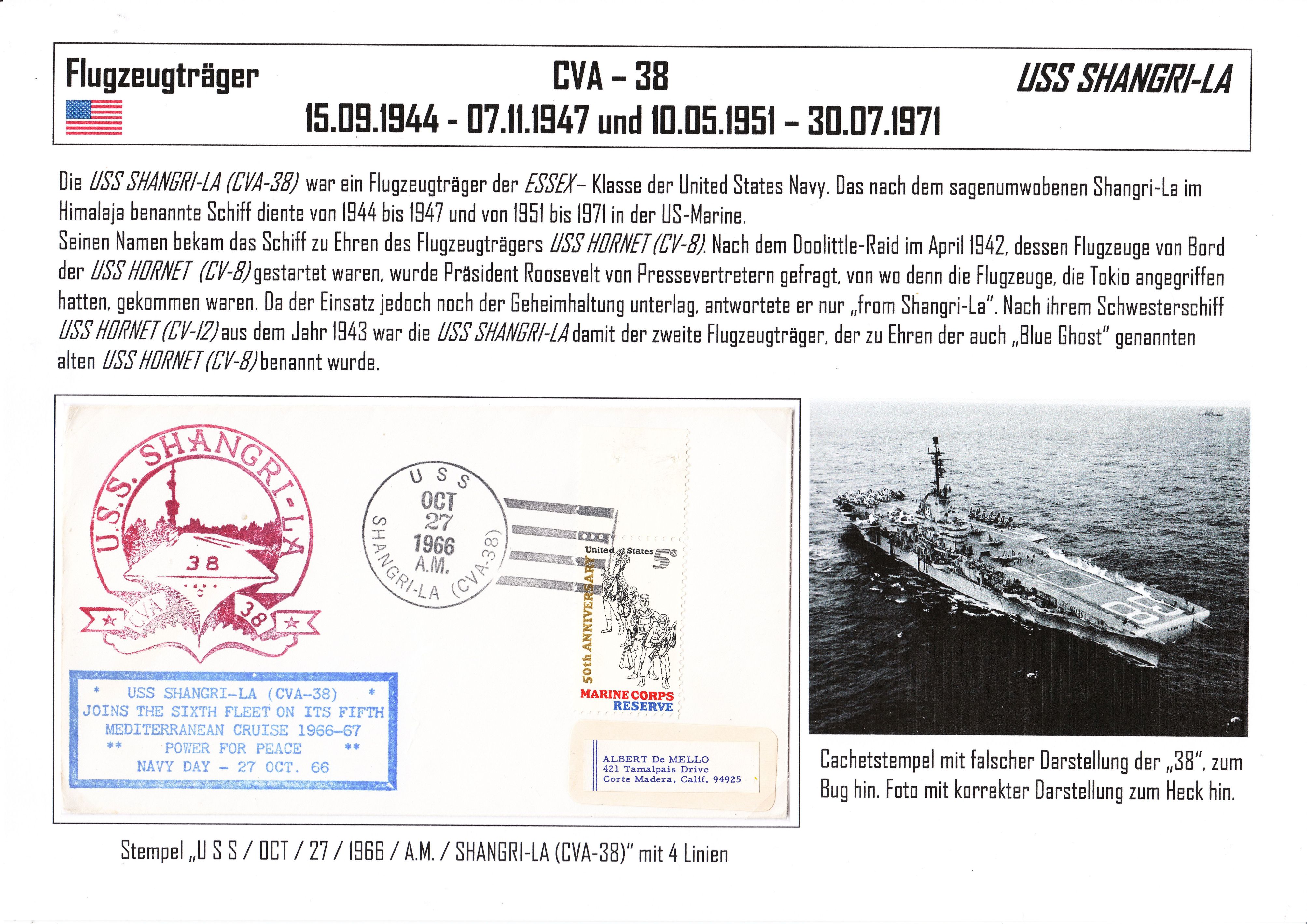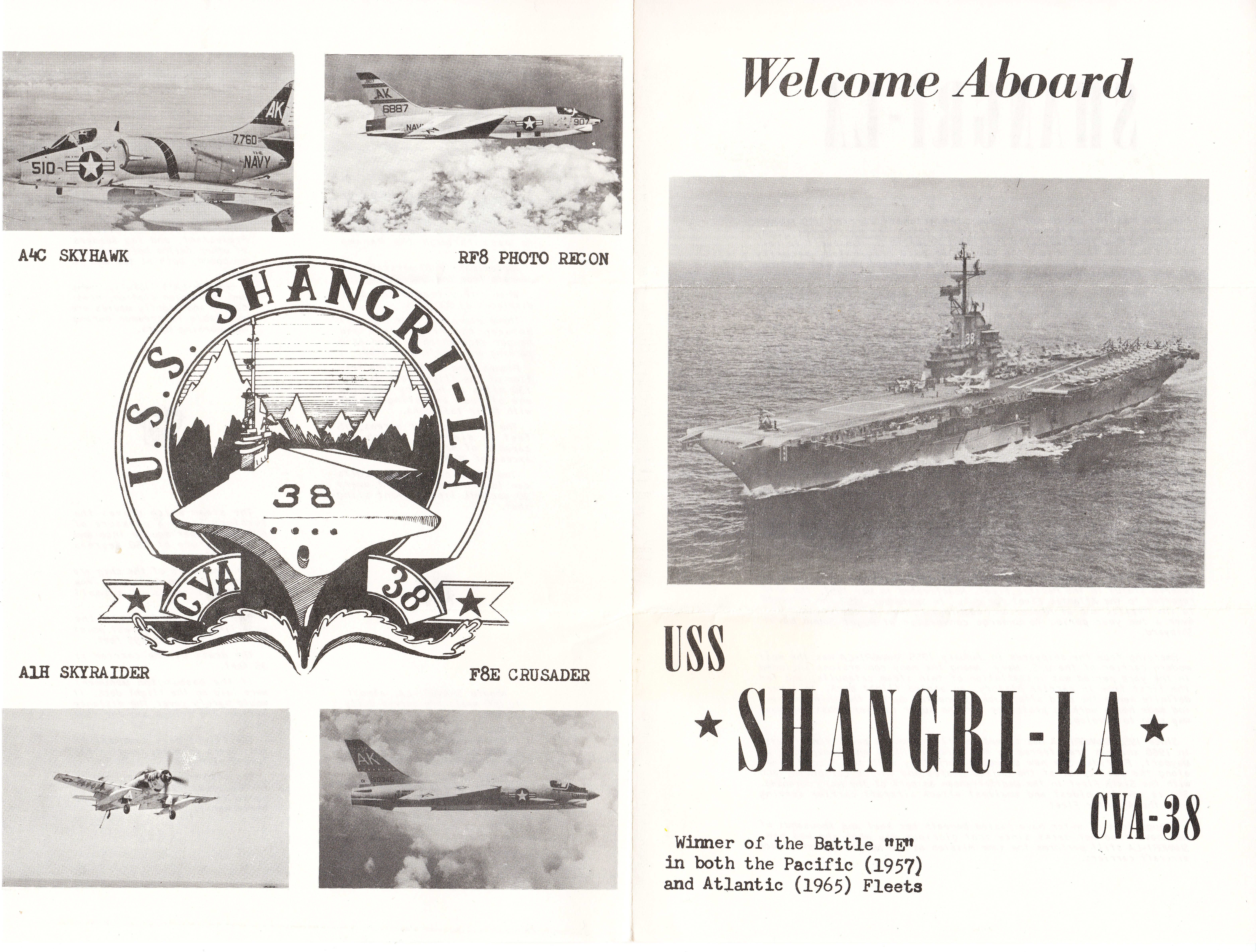 Solche etwa DIN A4 großen, beidseitig bedruckten und einmal gefalteten Flyer wie dieser der "USS *SHANGRI-LA* CVA"-38 passen sehr gut zu diesem Sammelgebiet, denn sie geben hilfreiche Informationen zum jeweiligen Schiff, die sich in einer thematischen Sammlung verarbeten lassen, aber seht selbst: