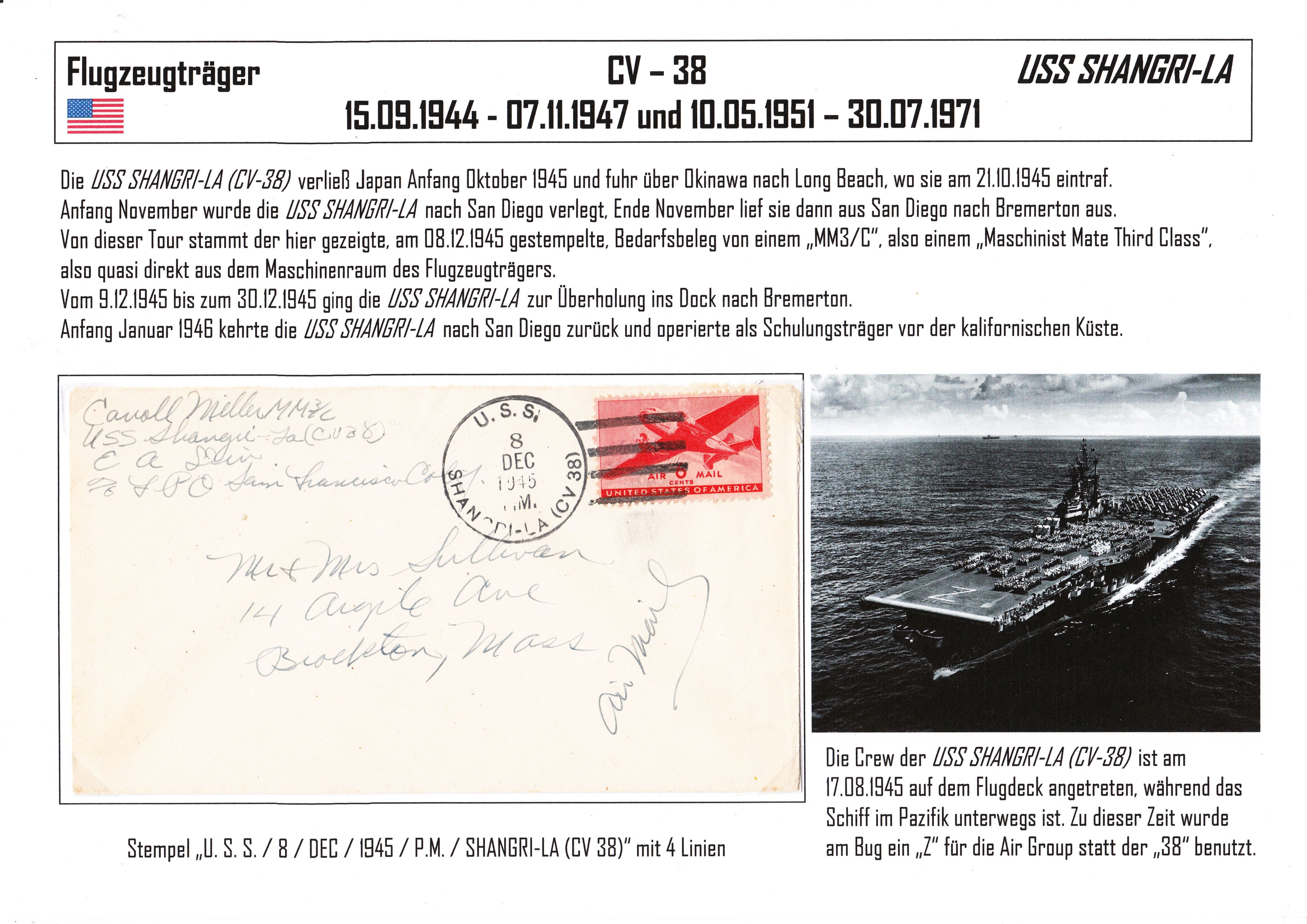 Das folgende Albumblatt zeigt einen Beleg vom 08.12.1945 und dokumentiert somit die erste Einsatzperiode der USS SHANGRI-LA (CV-38):