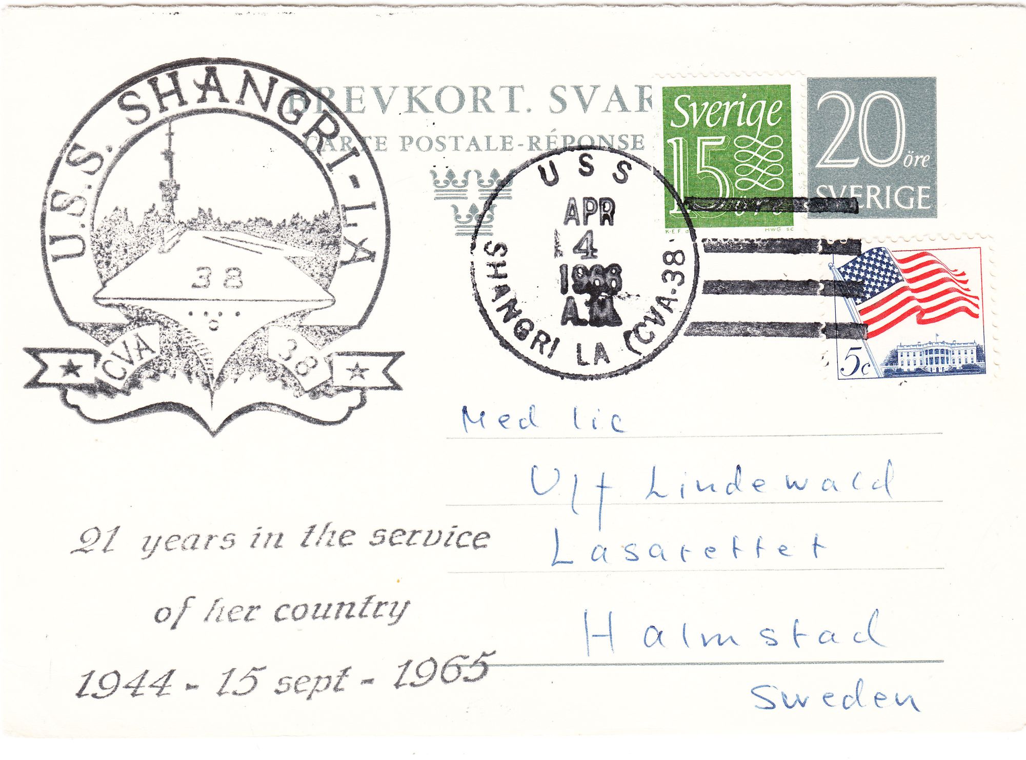Zu sehen ist der gleiche Cachetstempel wie auf der zuvor gezeigten Antwortkarte, bei diesem Beleg aber in Rot abgeschlagen, und die passende Entwertung an Bord der USS SHANGRI-LA (CVA-38) wurde in diesem Falle auch nicht vergessen: