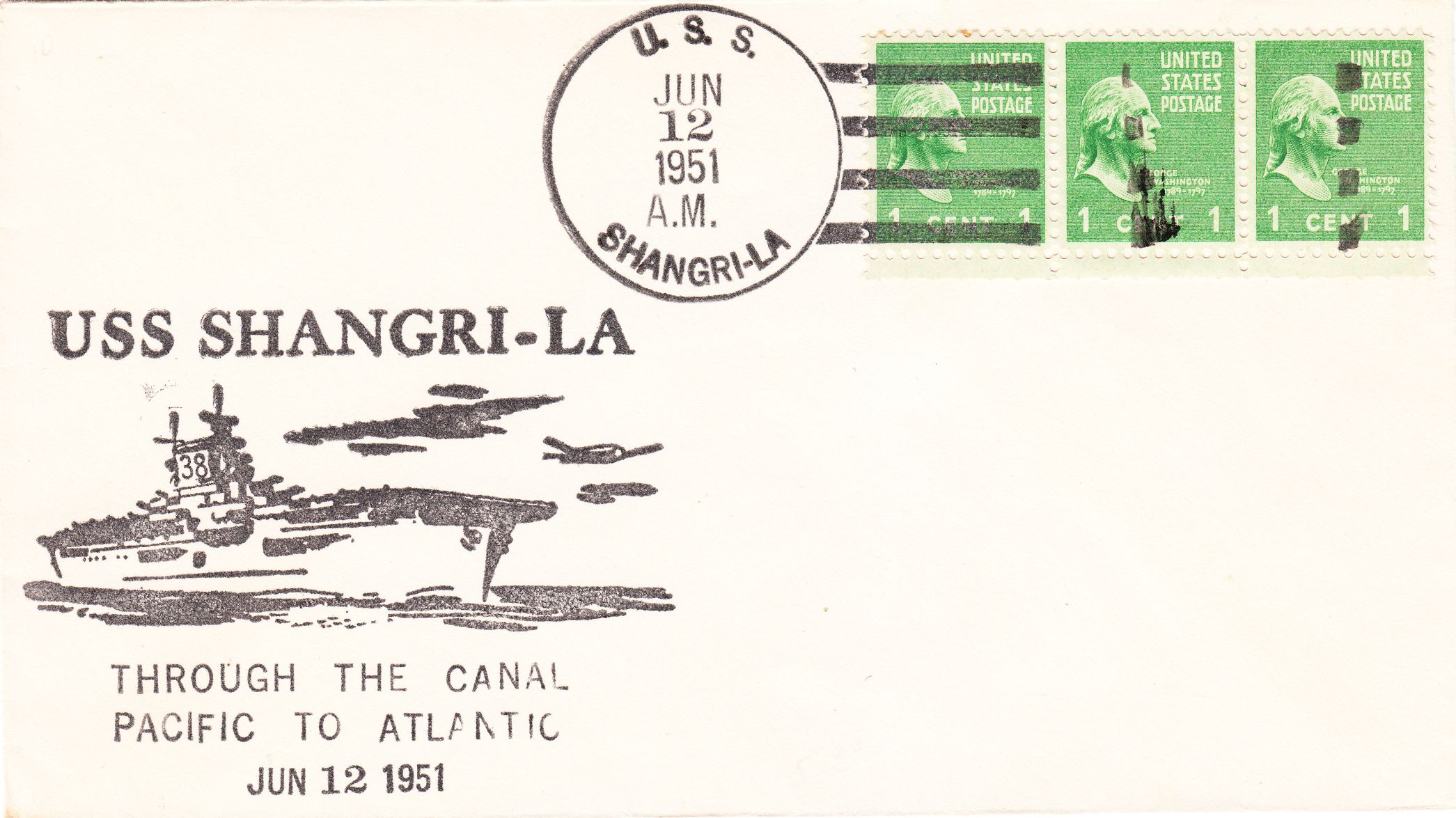 Dieser Beleg dokumentiert mit einem speziellen Cachetstempel die Fahrt der USS SHANGRI-LA (CV-38) durch den Panamakanal vom Pazifik in den Atlantik am 12.06.1951: