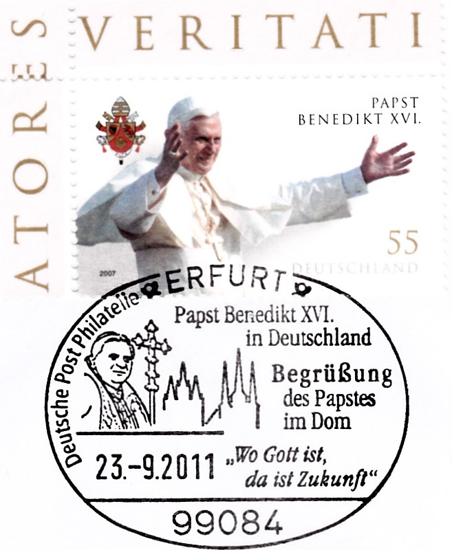 Ein Sonderstempel vom 23.9.2011 aus Erfurt dokumentiert den Besuch von Papst Benedikt XVI. in Erfurt.