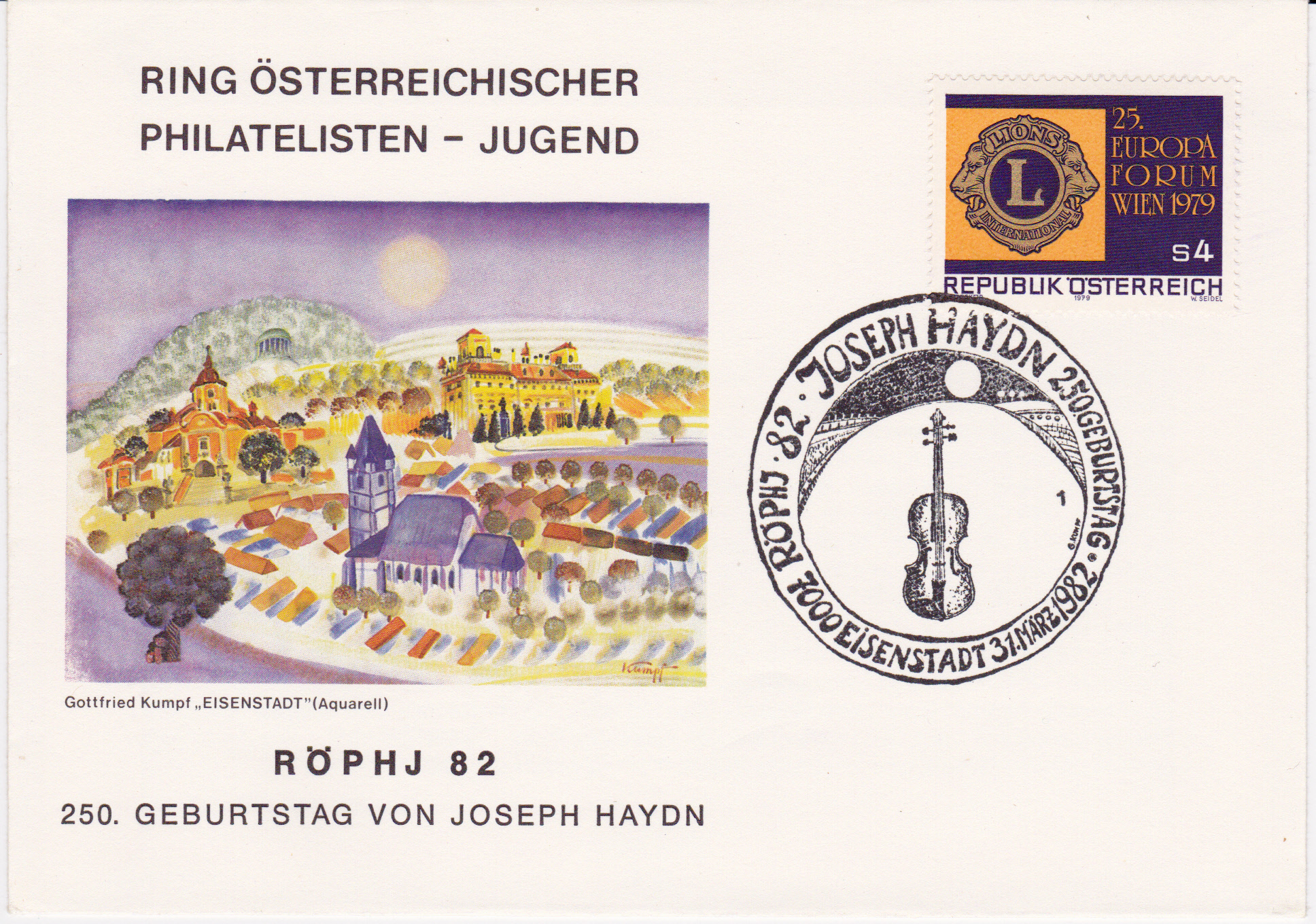 Auch dieser Sonderstempel aus Eisenstadt zum 250. Geburtstag von Joseph Haydn mit der Kennziffer "1" wurde von G.Kumpf entworfen.