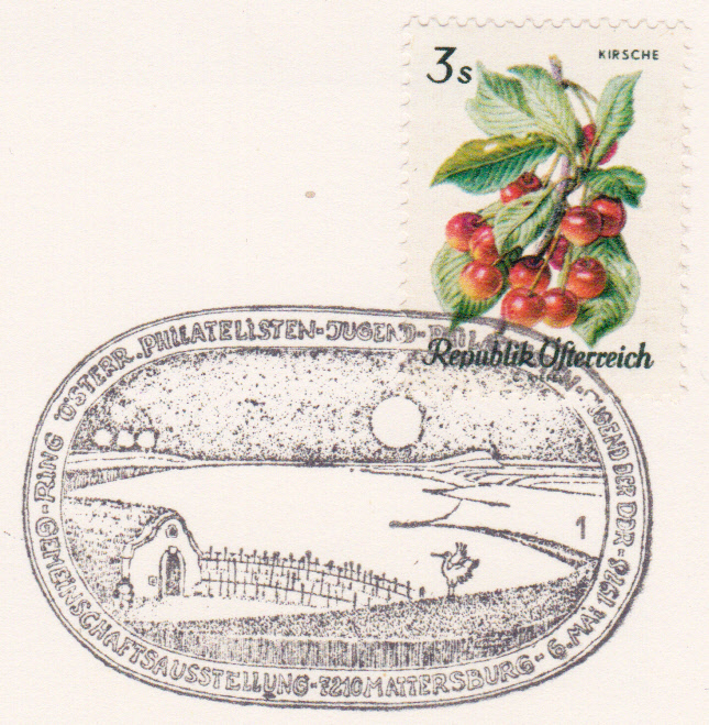 Einen weiterer Sonderstempel entworfen von Gottfried Kumpf gab es zur Gemeinschaftsausstellung des Ringes Österreichischer Philatelisten Jugend mit der Philatelisten-Jugend der DDR in Mattersburg. Hier ein Stempel vom 6.5.1978 mit der Kennziffer "1".