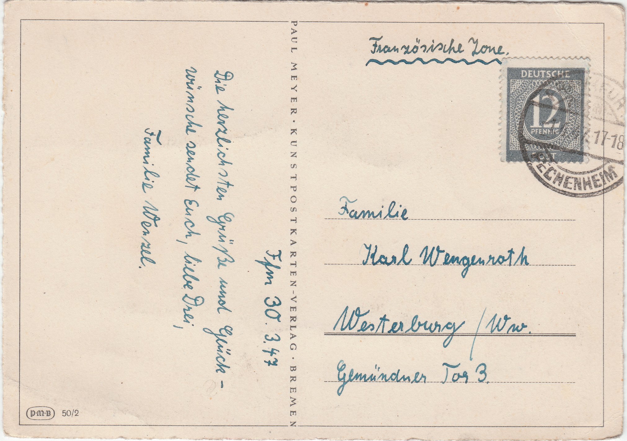 EF der MiNr. 920 in der Farbe dunkelgrau, deutlich nach unten dezentriert, am 01.04.1947 portorichtig auf Fernpostkarte (12 Pf) von Frankfurt nach Westerburg im Westerwald in der Französischen Zone: