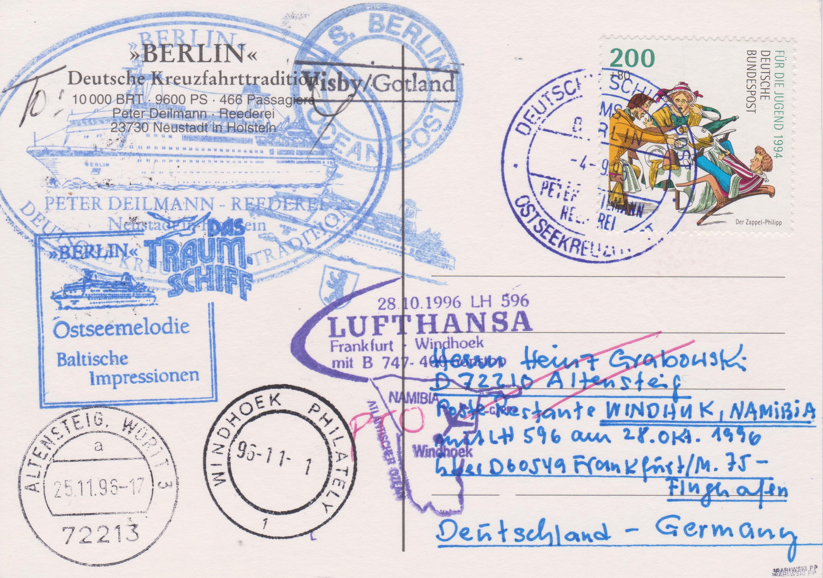 Dieser Beleg, eine Ansichtskarte des Schiffes MS BERLIN, wurde als Zuleitungspost an Bord des Kreuzfahrtschiffes MS BERLIN aufgegeben und trägt daher den Bordstempel des Schiffes und die deutsche Frankatur wurde mit dem Schiffspoststempel entwertet: