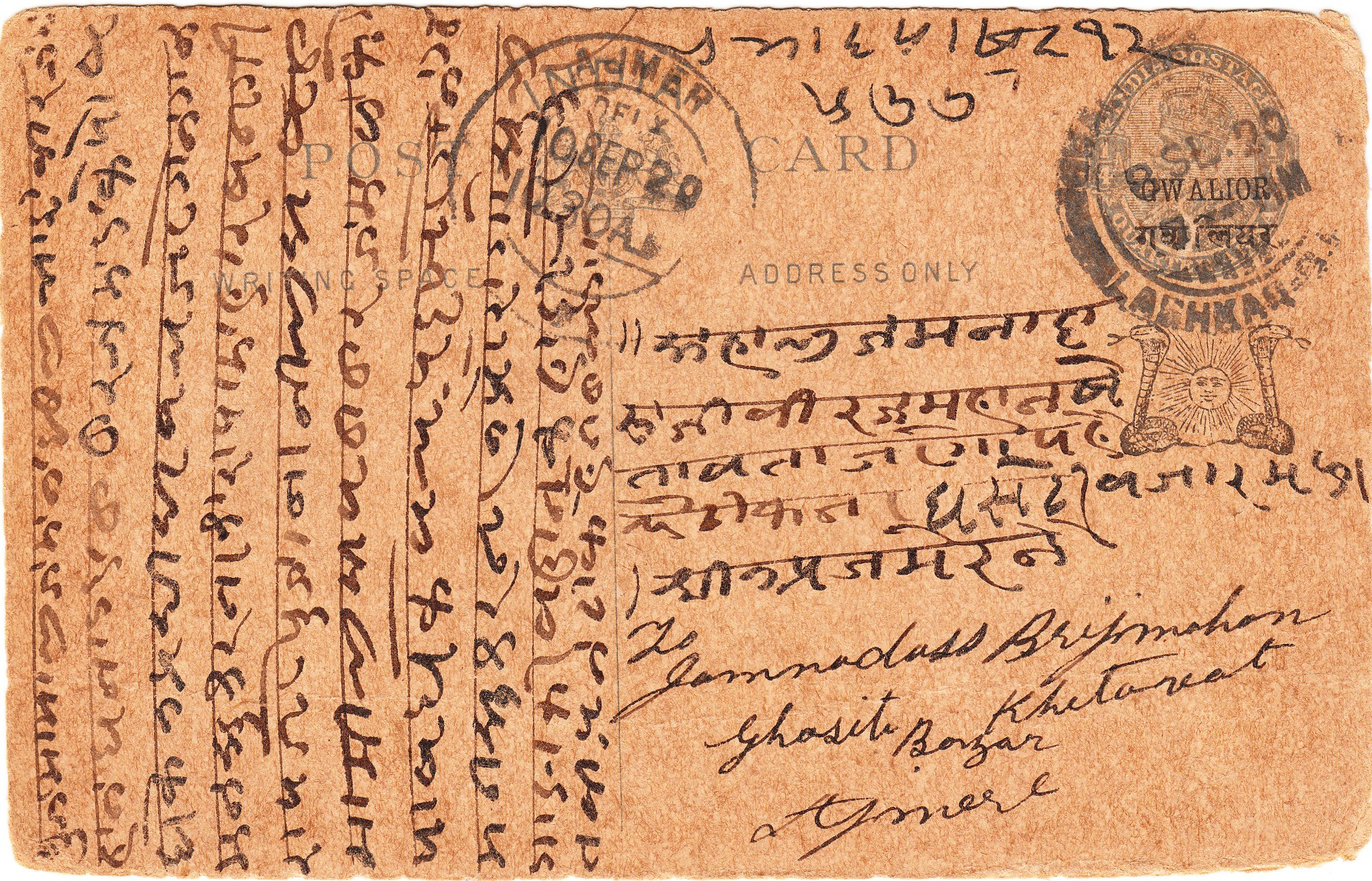 Die Postkarte ist adressiert nach "Ajmer", einer Stadt im indischen Bundesstaat Rajasthan, wo am 10.09.1920 ein Tagesstempel als Ankunftsstempel abgeschlagen wurde.