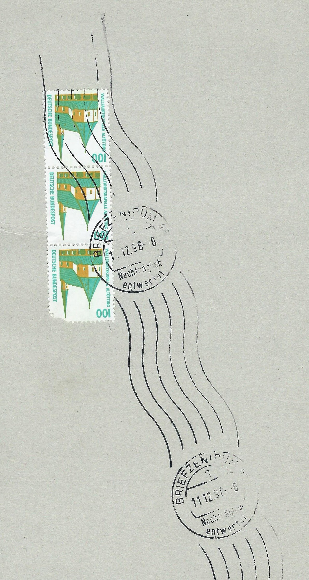 Du hast natürlich Recht, es ist ein Handrollstempel. Wir hier auf Tauschtagen sagen immer nur Wellenstempel dazu, daher bin ich beim Schreiben in unseren "Slang" gerutscht. Aber gleich noch einer hinterher, den durfte ich auf der Messe Essen aus dem Fundus des Jugendstandes mitnehmen: Handrollstempel Nachträglich entwertet Briefzentrum 48 vom 11.12.98 auf einem Stück Pappe. Ich denke mal, das wird alleine von der 3 DM-Frankatur her ein grosser